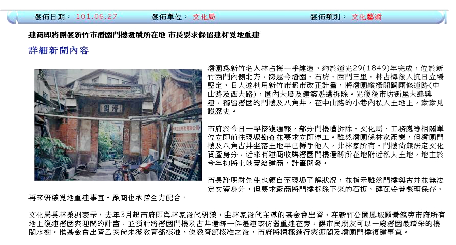 但末段卻頗見玄機,原來,移地重建的計畫早已商討年餘,報導中文化局長極為淡定地表示:「去年3月起市府即與林家後代研議,由林家後代主導的基金會出資,在新竹公園風城願景館旁市府所有地上復建潛園爽迎閣的計畫,並預計將潛園門樓及古井遺跡一併遷建或仿舊重建在旁,讓市民朋友可以一窺潛園最精采的樓閣水榭。惟基金會出資乙案尚未獲教育部核准,俟教育部核准之後,市府將積極進行爽迎閣及潛園門樓復建事宜。」