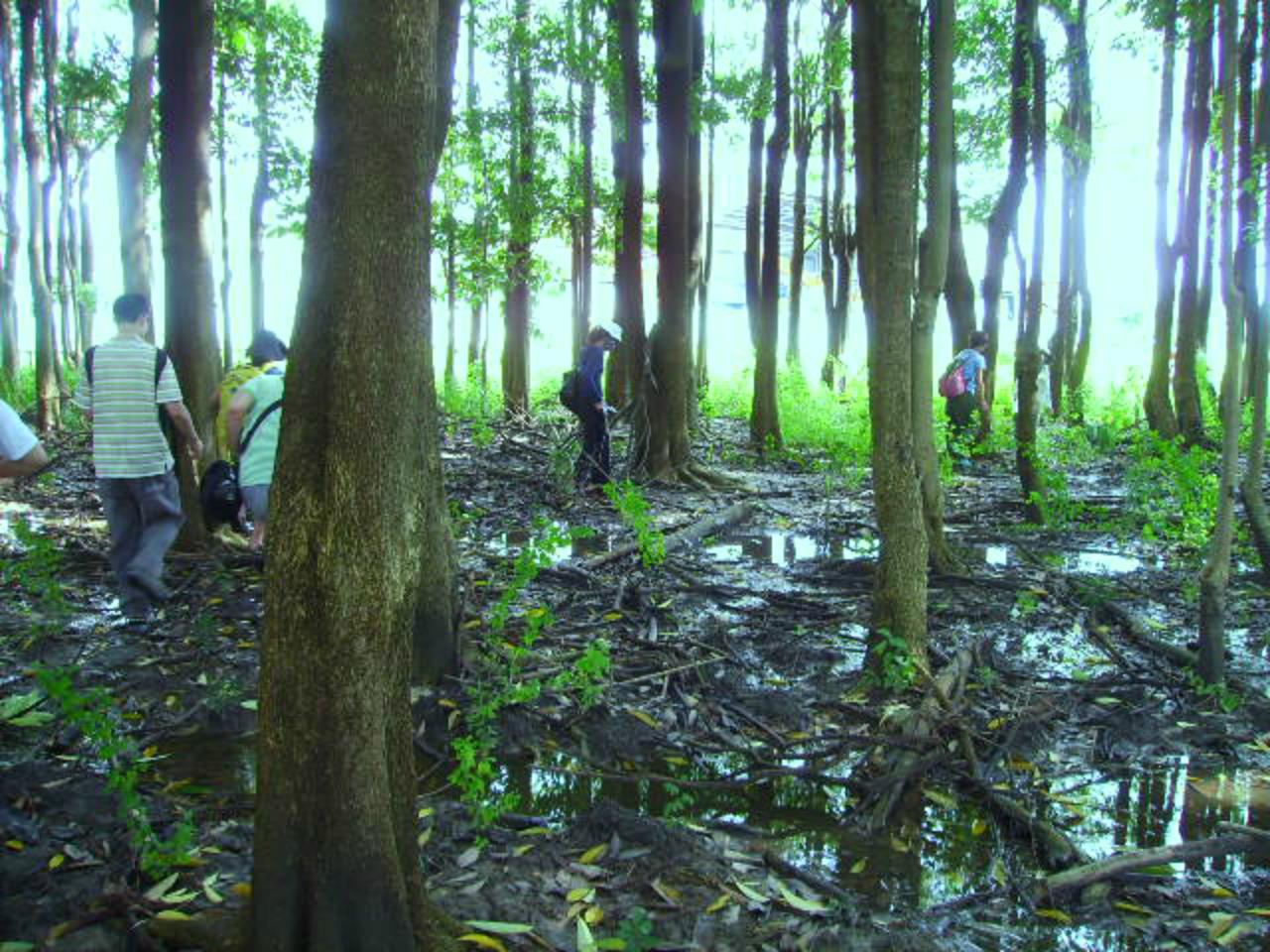 這次的活動範圍在蘆竹湳(台中市烏日區)及下庄(台中市南區),綠川與旱溪流經這兩個區域,最後綠川匯入旱溪,五張犁圳由綠川引水,阿嘧哩圳由旱溪引水。其中位於烏日區的蘆竹湳已被劃定為區段徵收區域,原本預計今年執行。但因土地市價徵收日期未定使得進度延宕,所以這次我們才得以進入這段被夾在綠川與住宅區尚存的小小農村。從福田汙水廠出發,帶頭的H領著大家沿著水圳、田埂行走,行間穿過了一處種滿黑板樹的田地。與連日大雨過後的泥巴奮戰是一件需要專注的事情,小心翼翼地穿越後,才發現自己穿越的不只是一片樹林,而是區段徵收下的產物。