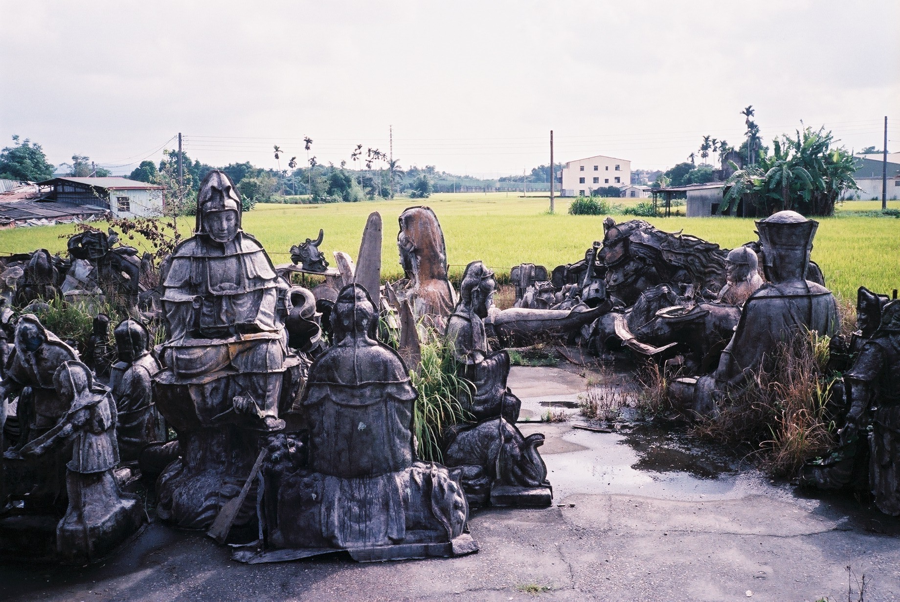 我們來到了天后宮,綠川與旱溪的匯流處,H在此說明今天的預定路線。在天后宮的旁邊有處棄耕的農地,被租用來堆放各種人像的模具。棄耕的農地在這個農村的用途還有什麼呢?在這個農村裡看見的,也許是租用給因無法達到工業區門檻而撤退到此的各種小型精密工廠,或是任憑雜草蔓生的農地上被傾倒廢棄物。