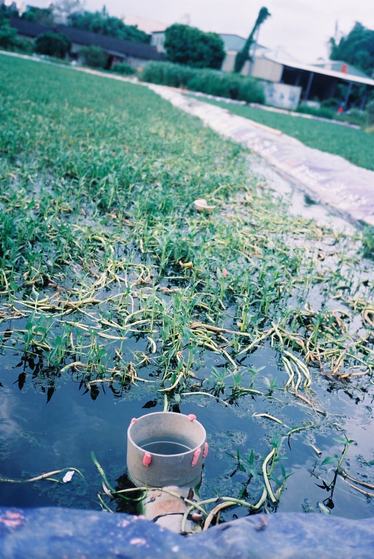 充滿福壽螺的甕菜田,用充滿異味的圳水灌溉著。照片與數據都沒有氣味,到當地才知道什麼是中度汙染的味道。