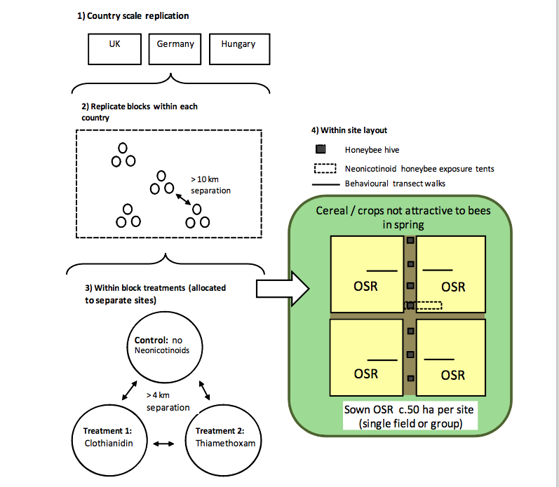 這項為期一年多的研究涵蓋33塊分別位於德國、英國與匈牙利的實驗田,面積達2000公頃,相當於3000座足球場,是蜂群陸續消失以來,有關類尼古丁的最大規模田間研究。這三國代表不同生態與地理環境,但都是密集栽種,符合類尼古丁在歐盟農業中的使用情況。