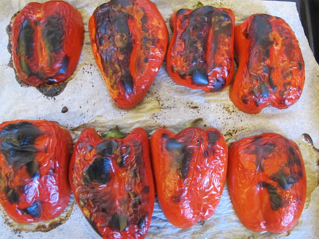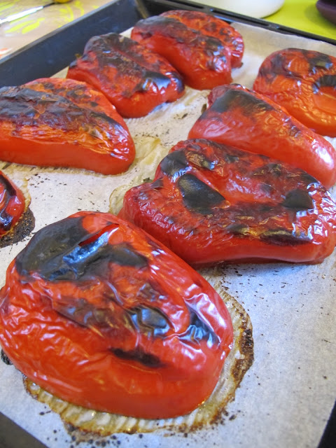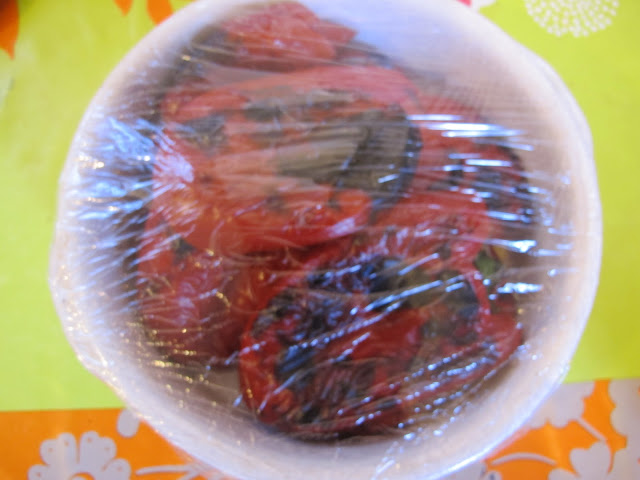 – 移出烤箱,放進ㄧ個大碗裡 保鮮膜包起來,等30分鐘冷卻後,方便將甜椒的皮去除.