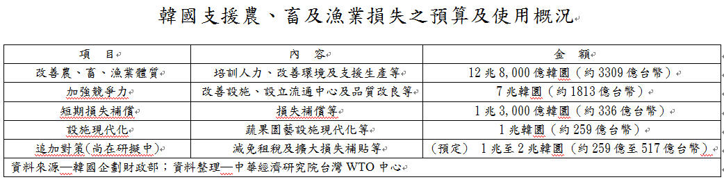 據此,韓國政府宣示至2017年,將籌措22兆1,000億韓圜,相當於新台幣6300億元,作為支援農業損失的對策資金與配套措施,其方法除了補貼,更重視改善農漁業體質,提升競爭力,希望降低進口農產品的衝擊。(詳見以下整理)