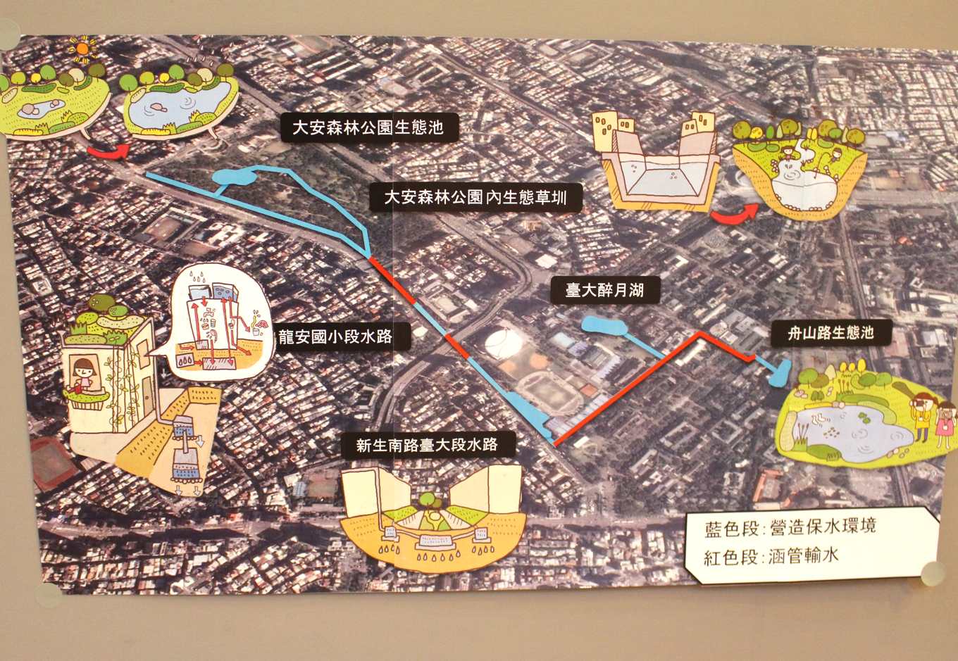 最後從龍安段流至大安森林公園,環藝工程顧問公司總監潘一如表示,思考路線時一直想要這條水圳能夠親民又不擾民,大家能夠感受深刻,目前在大安森林公園裡規劃儲水池、淨水濕地公園、水上飛輪健身綠廊,讓居民騎腳踏車不只娛樂用還能淨水,另外也會規劃水資源解說廣場、生態草圳等,其中也在整條水圳上設置許多水撲滿,作為每個節點的儲水器,可收集50噸雨水,「我們希望大安森林公園的生態池面積慢慢擴大,培養出生態多樣性,經過好的科學解說,成為生態圖書館示範場。」