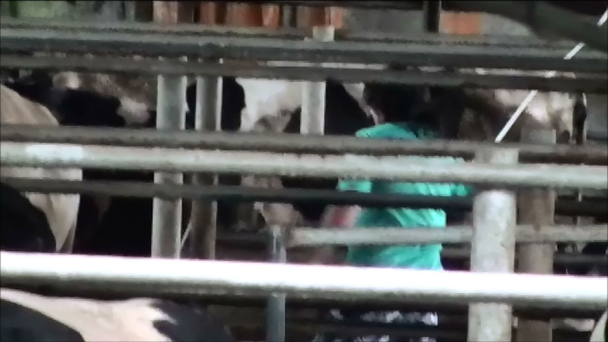 陳玉敏說,宰前的繫留時間約2、3天,工作人員都不給牛喝水、進食,為怕體重減輕,卻每次集中在2分鐘時間內,用200多公分長的硬質水管插入牛胃,另一頭接50公分長的鋼管後,然後以強力水柱灌入體內;經測試,2分鐘的水持續流灌,達80公升之多;畫面中的牛痛苦,不僅眼神求助無門,胃裡尚有的物質都被沖出、嘔吐出來。
