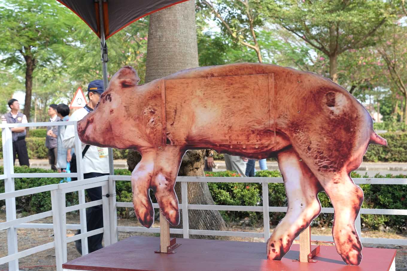 機場和漁港的防疫重點在於阻絕境外,但若境內發生疫情該如何處理?下午的演習就模擬有豬場發現豬隻不尋常病死,從通報、獸醫檢視、採樣確診、撲殺到焚化掩埋等步驟,現場將血跡斑斑的道具豬送上卡車,就地挖坑焚燒,再以怪手掩埋,濃煙與塵土飛揚,過程十分逼真。