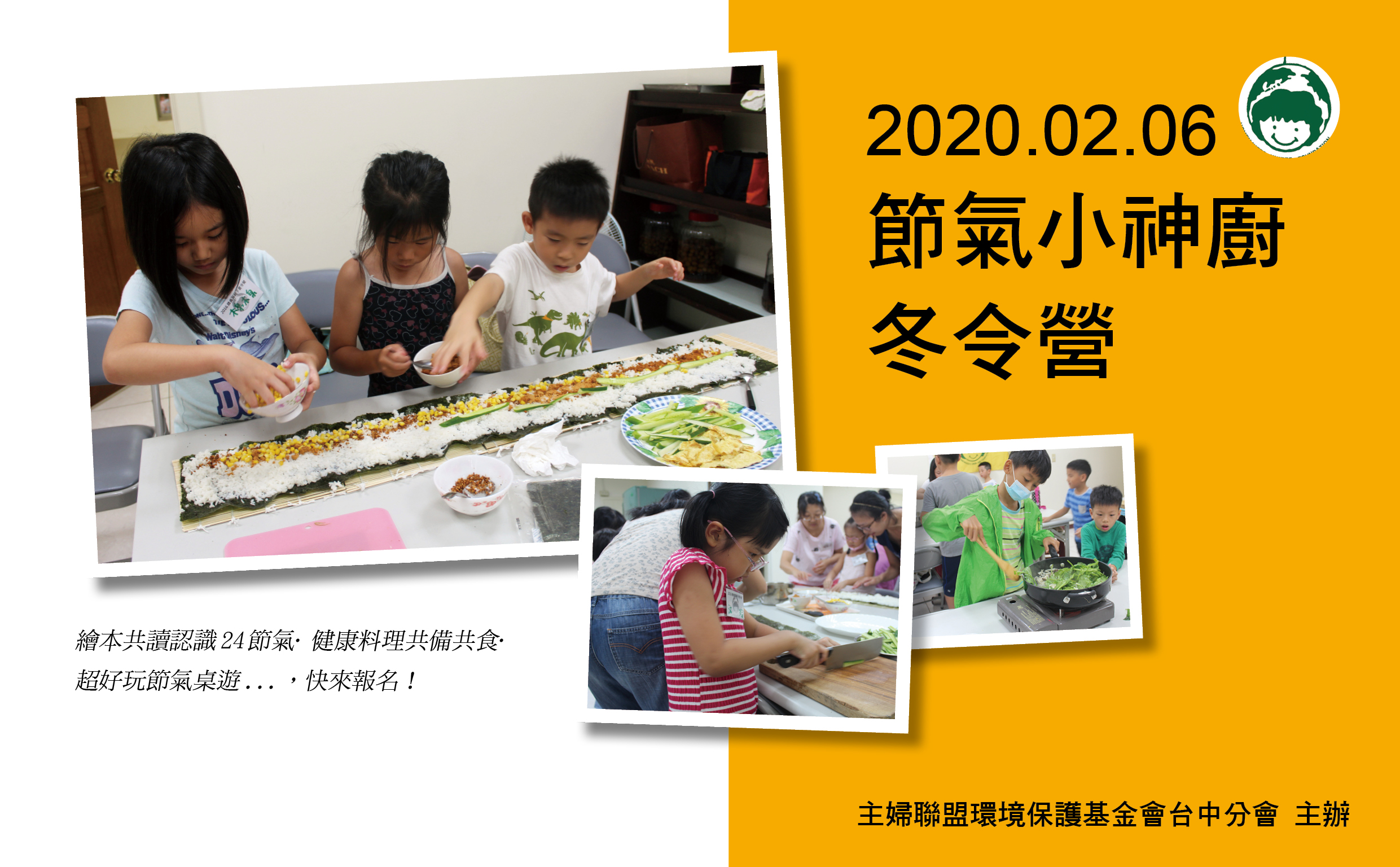 我們都知道食物應選擇當季當地的,可減少食物碳的里程數,同時也兼顧美味及健康,但您的孩子認識當季的食材嗎?歡迎來參加我們2/6在寒假期間開的【節氣小神廚 冬令營】,我們會透過生動活潑的繪本及桌遊一起來認識24節氣及食材,同時也會實際帶孩子們從設計菜單、採買、到共備共食,透過完整的烹飪體驗讓孩子對節氣食材有更深刻的印象,爸爸媽媽們還在等甚麼?名額有限趕快報名喔!