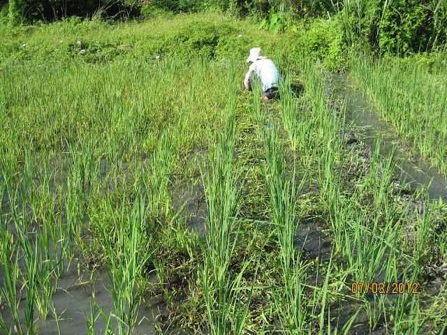 無耕水稻因為幾乎是插秧在草裡面,除草是一定免不了的工作。但令人驚奇的是下層水較深的部分,似乎因為環境相當適合水稻,水稻生長得很迅速,再加上水深也一定程度抑制了雜草,所以根本不用除草。只在上層水不夠深的部分,需要適當的除草,但也只需要除一次草就能維持到抽穗了。工作比想像的少呢!