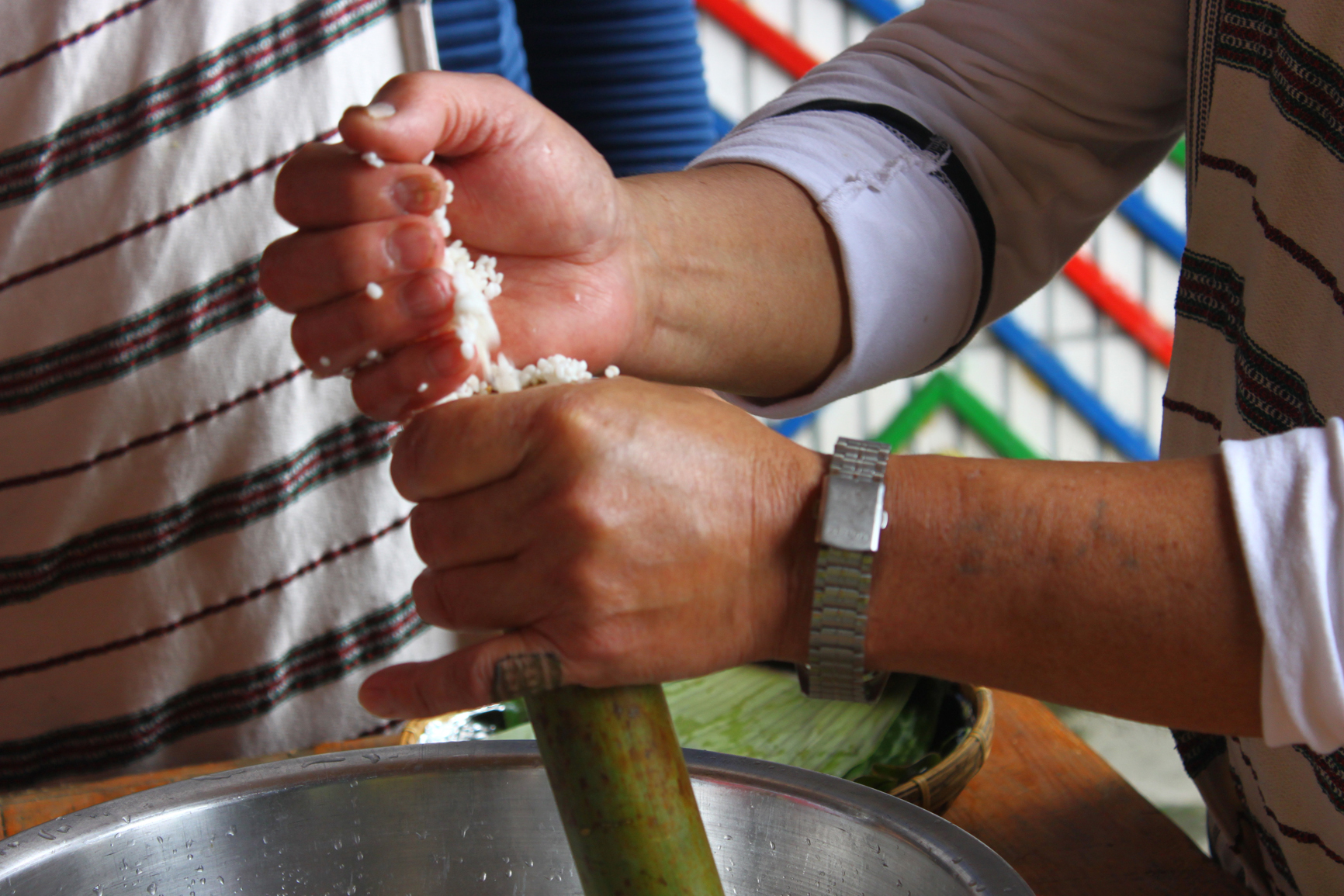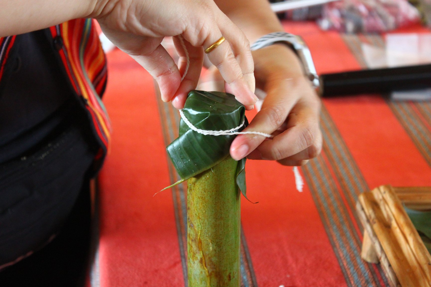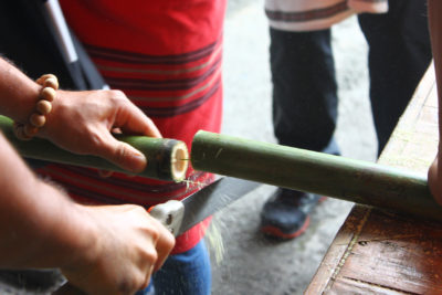 緊接著,山豬爺爺教導遊客手腳並用,在大腿上將棉線捻為紮實的雙股線,並體驗手鋸桂竹、填糯米與山泉水、利用芭蕉葉封蓋,自製午後進入獵場的竹筒飯包。隨後跟著山豬爺爺進行部落巡禮,一面走訪樂水部落以竹木搭建的青年會所、烤火屋、瞭望台等特色建築,一面揭開這座曾經繁華也曾被遺忘的部落,是如何在太平山伐木的年代成為大同鄉的行政重鎮,又如何在大水過後、林業禁伐之後,進入了長達二十年形同孤島的歲月。