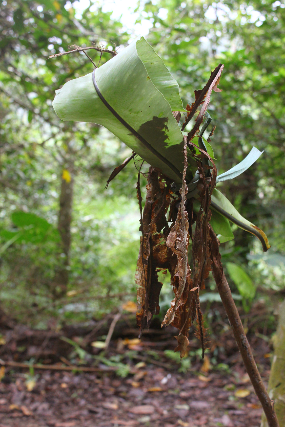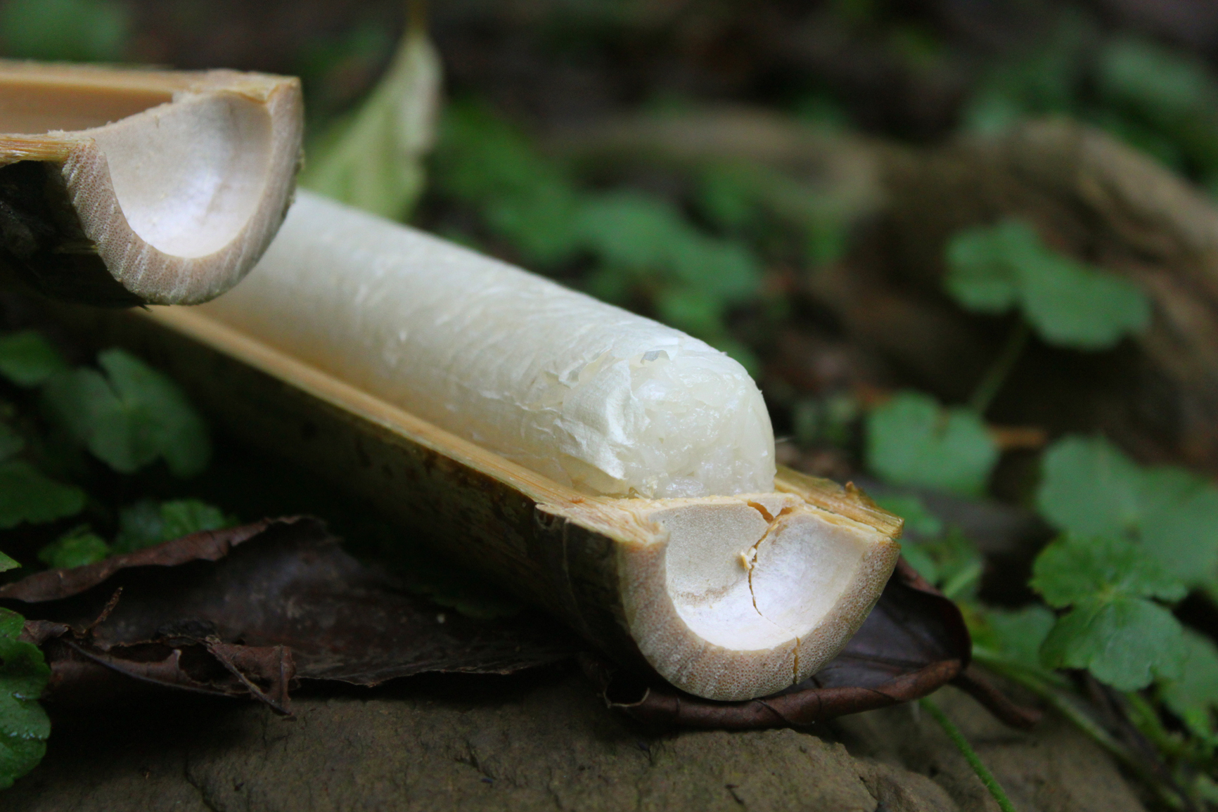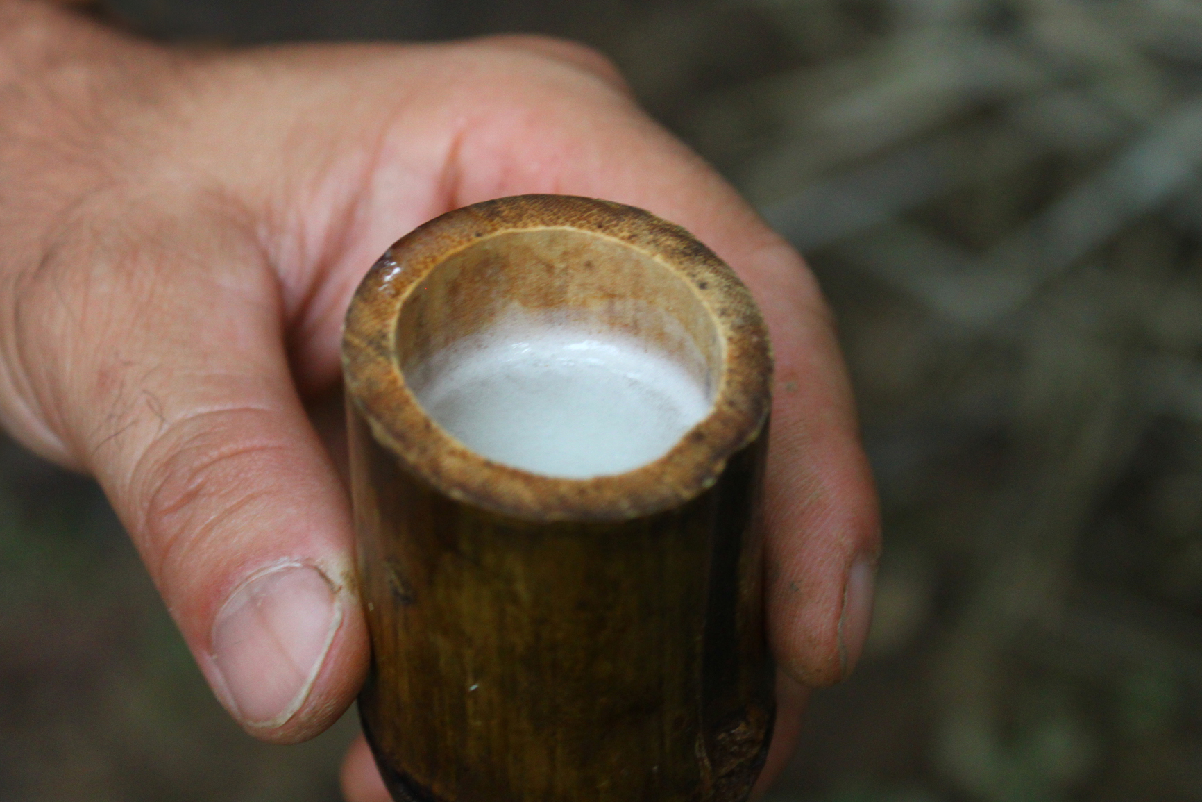 酒足飯飽後整裝出發,遊客排排坐在半露天的小貨車內,一路前往鄰近的自家獵場,亦步亦趨隨著山豬爺爺的腳步進入山林。山壁旁看似不起眼的野生植物,透過山豬爺爺信手拈來,都一一幻化為日常食物或生活用品,像是潔白透絲的芭蕉心,是獵人在山林用來解渴的救命植物;經過拗折的姑婆芋葉片則可充當盛水的天然杯具,若反扣過來以樹枝固定,則瞬間成了防雨便帽;還有去除羽葉的山棕葉軸,其充滿彈性的纖維韌度,可用來充當簡易釣竿。不一會兒,只見山豬爺爺抽出山刀,將蓪草的莖幹俐落削皮、露出白色的髓心,這是早年製作美勞材料與蓪草紙的天然素材,觸感與保利龍的質地十分接近!