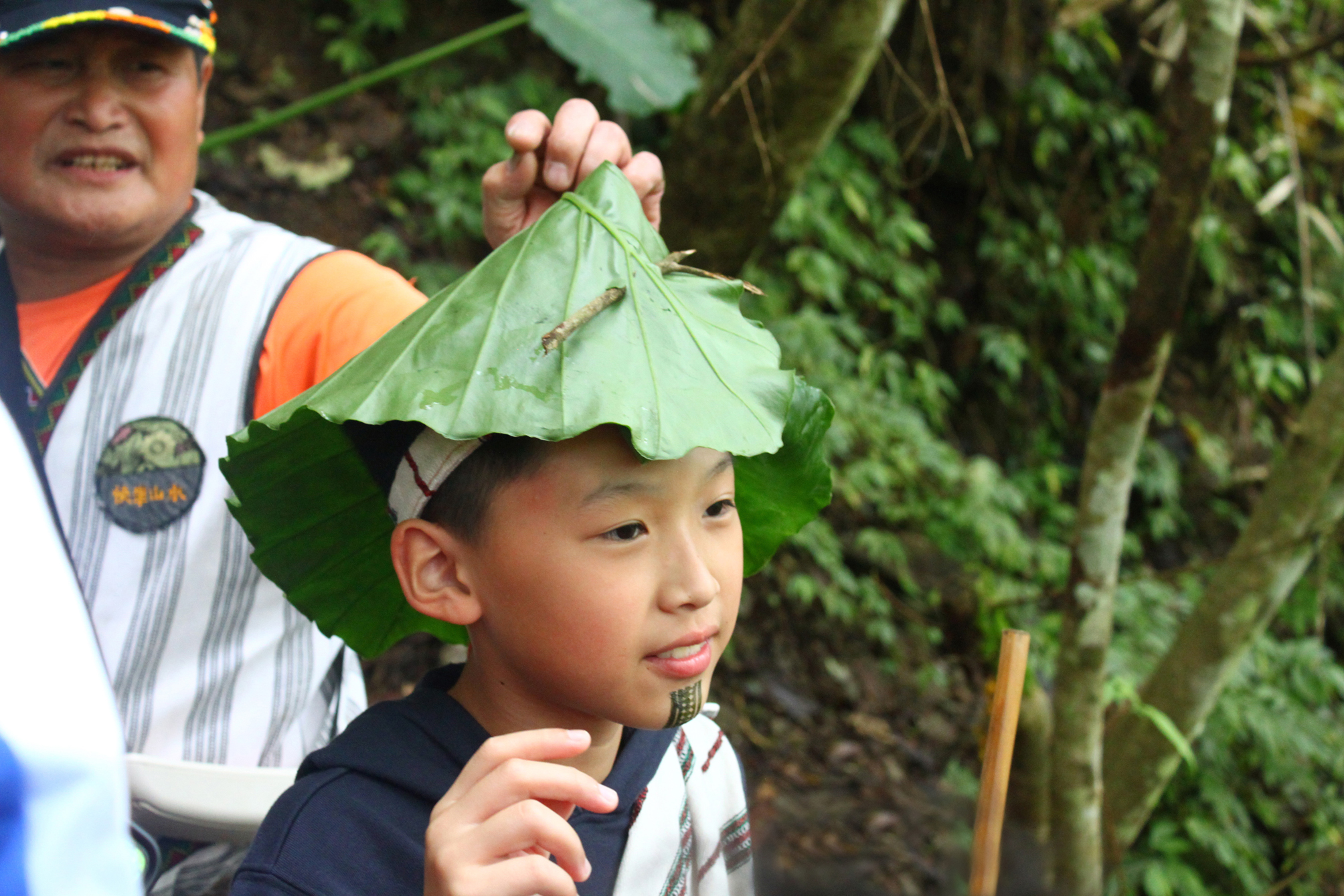 一大清早,遊客陸續抵達樂水,簡單迎賓後,遊客紛紛披上泰雅傳統服飾及頭帶,再貼上紋身貼紙象徵早期的紋面文化,只見孩童們各個躍躍欲試,像透過cosplay的儀式充當一日泰雅獵人!