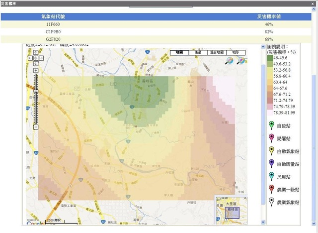 農試所表示,系統提供親和性的區域面化氣象資料的查詢功能,農民只要在Google map圖台上點選所在位置,就可經由地理資訊系統運算,得到當地即時的氣象資訊。氣候引起的天然災害雖然很難預測,但該系統利用長期歷史氣象資料透過統計分析方式,可讓使用者從過去災害發生機率,能對災害可能發生有所警覺而加以防範。