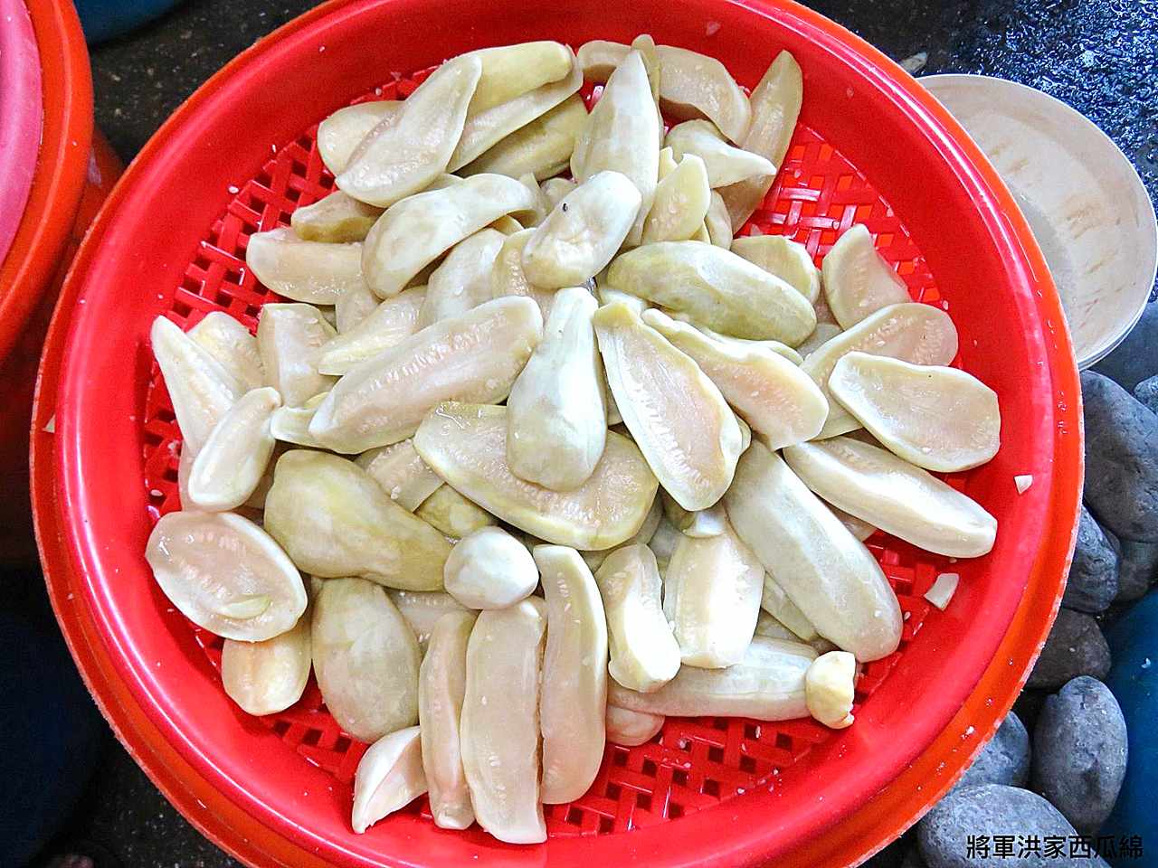 製作西瓜綿已逾30年的將軍洪家西瓜綿第二代老闆洪誠陽解說,醃製西瓜綿和一般醃製品差不多,採回來的西瓜幼果首先需要清洗和削皮,因為幼果的形狀與大小不一,所以多會縱切對半或切成四等份再進一步醃製。