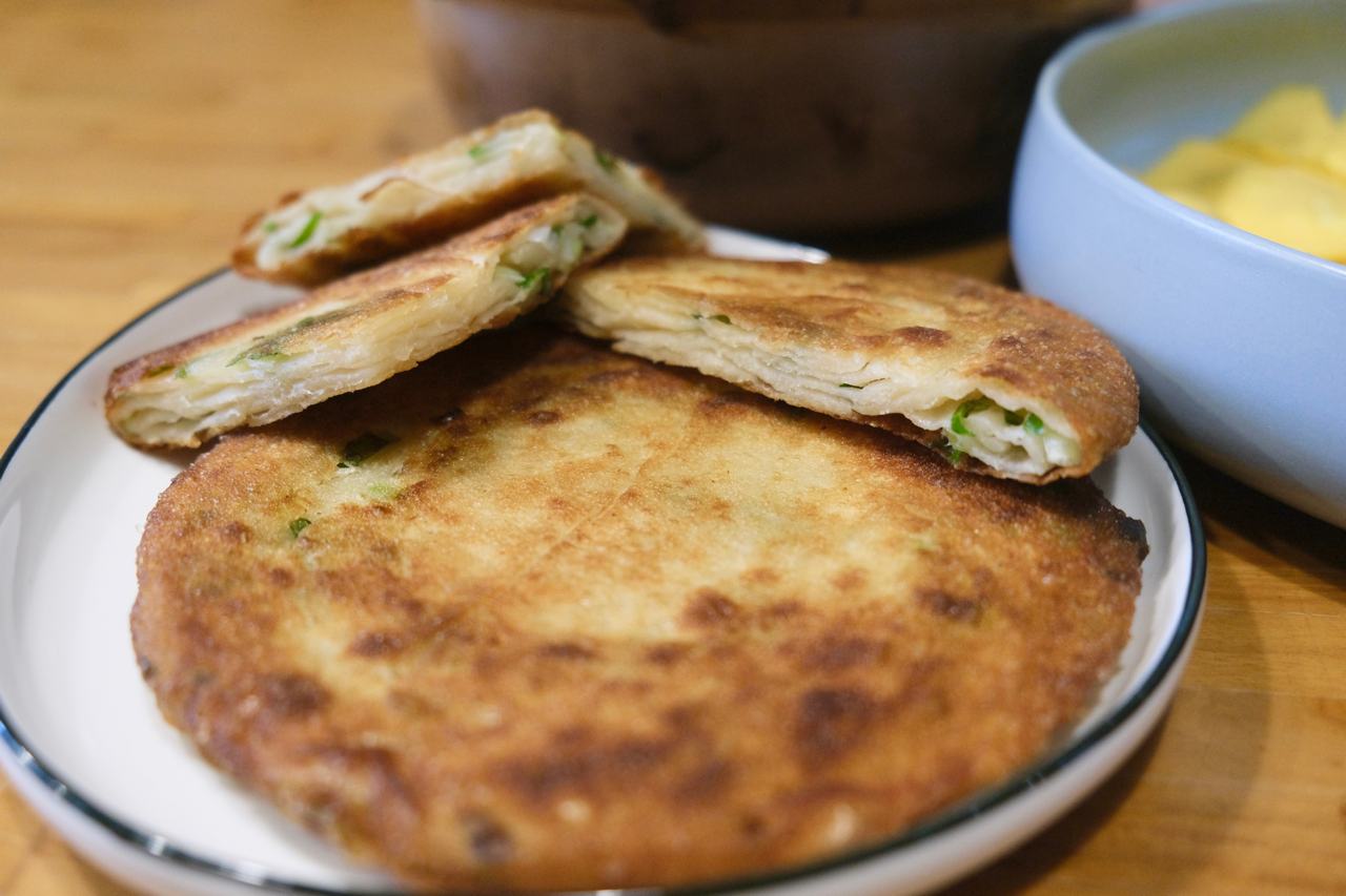 蔥油餅豐儉由人,是日常小吃,也是年節主食。王正怡細述,中式麵點的麵糰有發酵或不發酵兩種,後者又可以再分為冷水麵跟燙麵,燙麵又有發麵及不發麵,體系龐大。王正怡指出,蔥油餅屬於不發酵/燙麵/不發麵,關鍵是拿捏好水和中筋麵粉的比例,考慮到不是每個家庭都有磅秤,她建議以體積而非重量來測量。另外,她也分享買麵粉的小秘訣:「跟市場賣現做麵條的店家買,麵粉比較新鮮。」