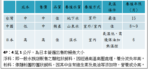 另外,日本的養殖業者,企業有提供保證收購的機制,因此他們敢於放心地投入購苗成本;相對而言,台灣養殖戶,除了資金不夠,還可能面臨藥檢問題及日方收購價格波動的不確定性因素,不敢貿然在苗價高時購苗。這些因素,造成台灣冬至前捕獲的鰻苗(6000尾/1公斤)大部分都走私往日本,日本也因而能掌握7月鰻魚節時的活鰻自給量,台灣活鰻輸日價格因而掌握在日方。台灣養殖的,是日本5月1日開放出口後,再從日本買回已養大的鰻苗(1000尾/1公斤),在時間點上的競爭上居於下風。