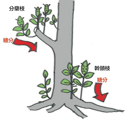 很多人對樹木的印象,可能都是「用樹根吸收養分」。樹根確實能夠吸收構成樹木主體的無機養分和水,但是,樹木無法光靠這些而存活。樹葉進行光合作用所轉化的糖分,對樹木的生長也非常重要。糖分(營養)主要由樹葉往下方運送。請試著用「由樹葉往下運送養分」的角度來觀察,樹木一方面從下方(根部)吸收無機養分和水分,一方面接收由上方(樹葉)往下運送的養分,其生長過程依靠的是雙方的平衡。