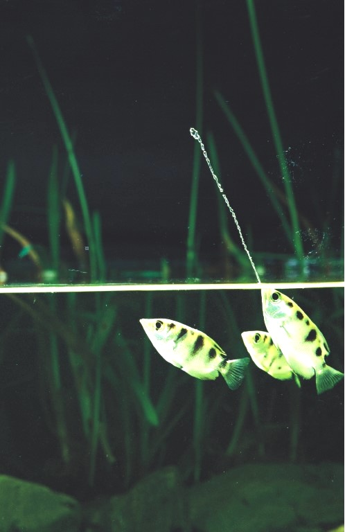 和豬齒魚利用水沖走沙子一樣,射水魚也會借助水來覓食,只不過牠們把水當作捕獵的武器。這些生活在熱帶水域中 10 公分長且銀色身軀兩側長了一排漂亮黑斑的「射手」,主要分布在從印度到菲律賓,從澳洲到波利尼西亞的河口、紅樹林以及溪流水域中。牠們的眼睛非常寬大而且十分靈活,能夠產生雙眼視覺。牠們還長著令人過目難忘的反頜(戽斗),可以起到類似槍管的作用。牠們用舌頭抵住上頜凹槽後突然收縮喉部和口部,就可以快速噴射出高達 3 公尺的水柱。射水魚會埋伏在甲蟲或蚱蜢棲息葉片下的死水中,從 1 公尺外噴水射擊,有些魚幾乎能做到百發百中。