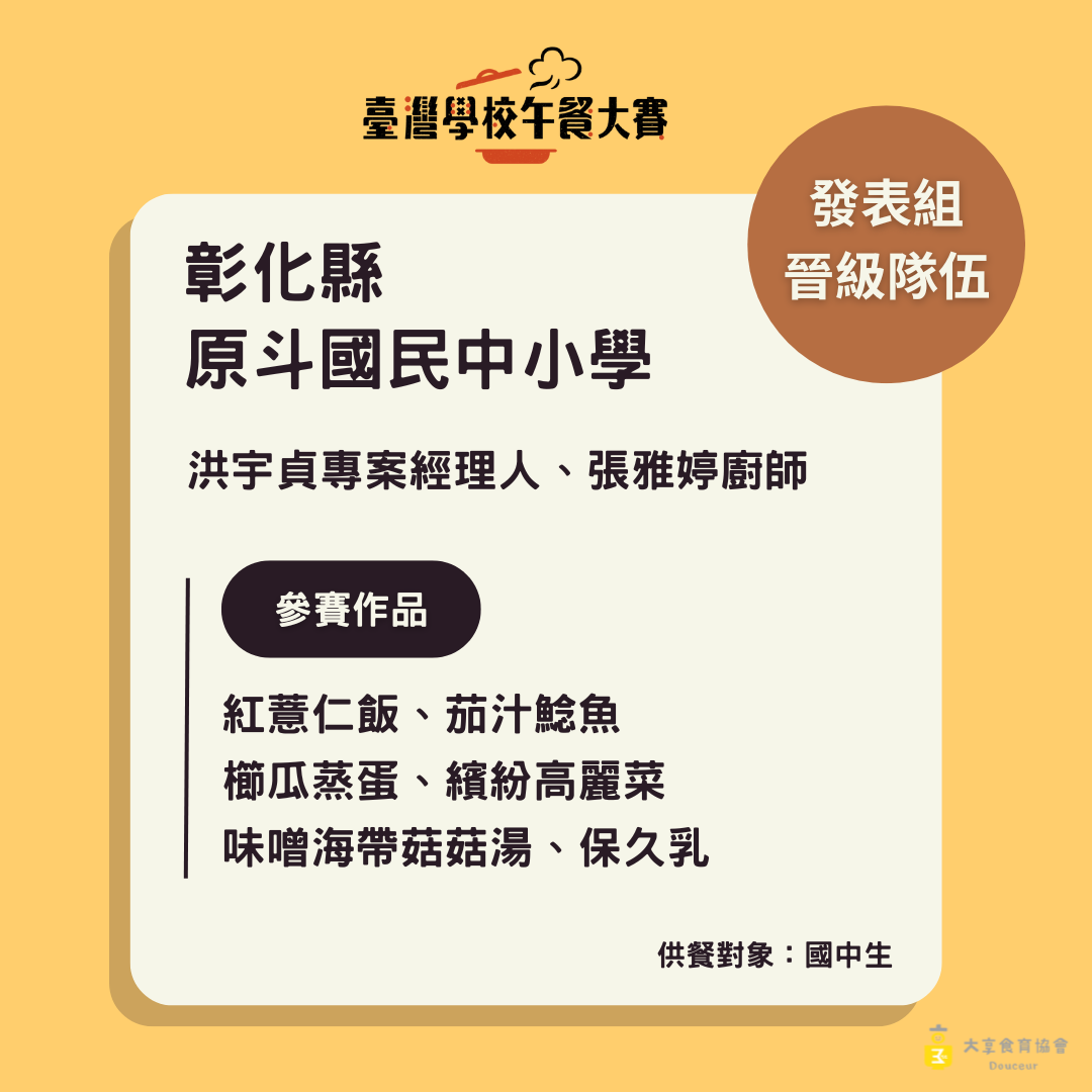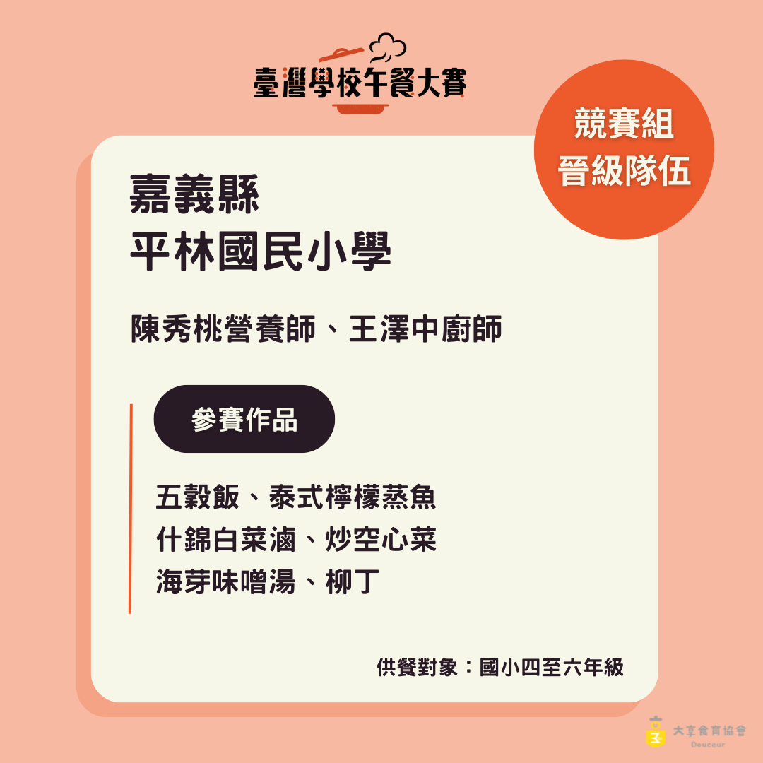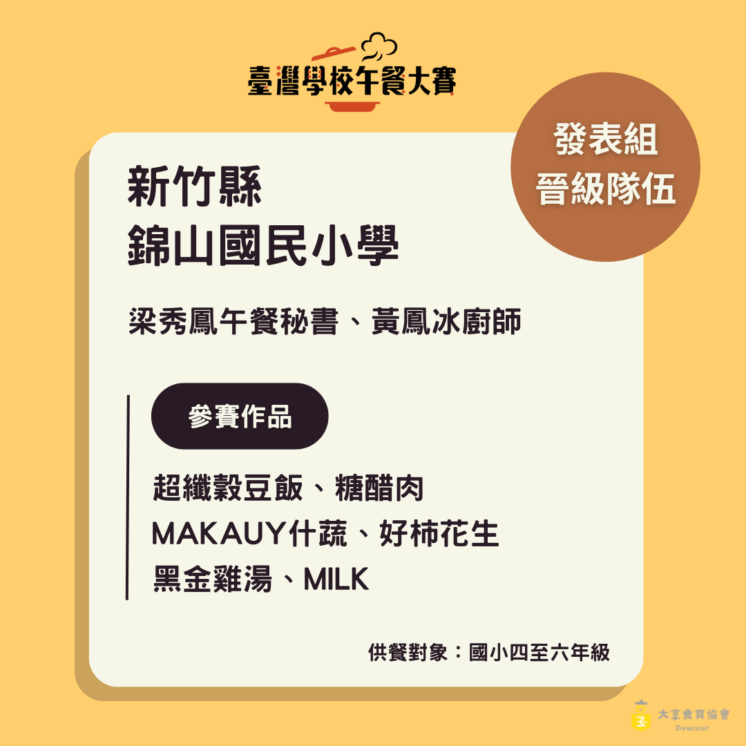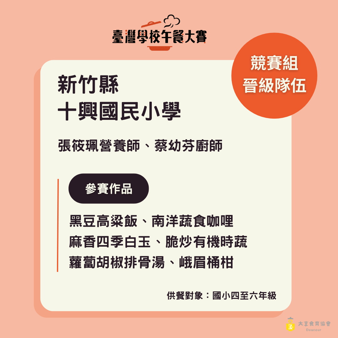 【2024年3月22日公告】 2024 第七屆臺灣學校午餐大賽「晉級決賽名單」出爐! 2024年4月27日至28日,來自全國6縣市12組24名現職學校午餐從業人員將踏上全國舞台,爭取一年一度最佳學校營養午餐的榮耀! 精彩賽事訊息不漏接:https://www.foodiedu.org/project/2205 恭喜以上晉級隊伍!