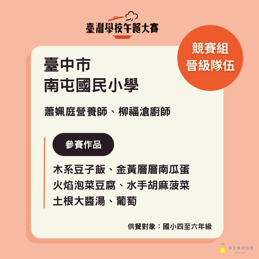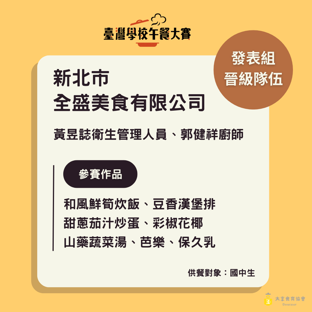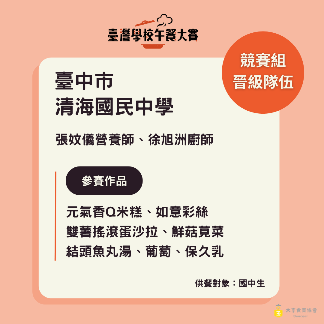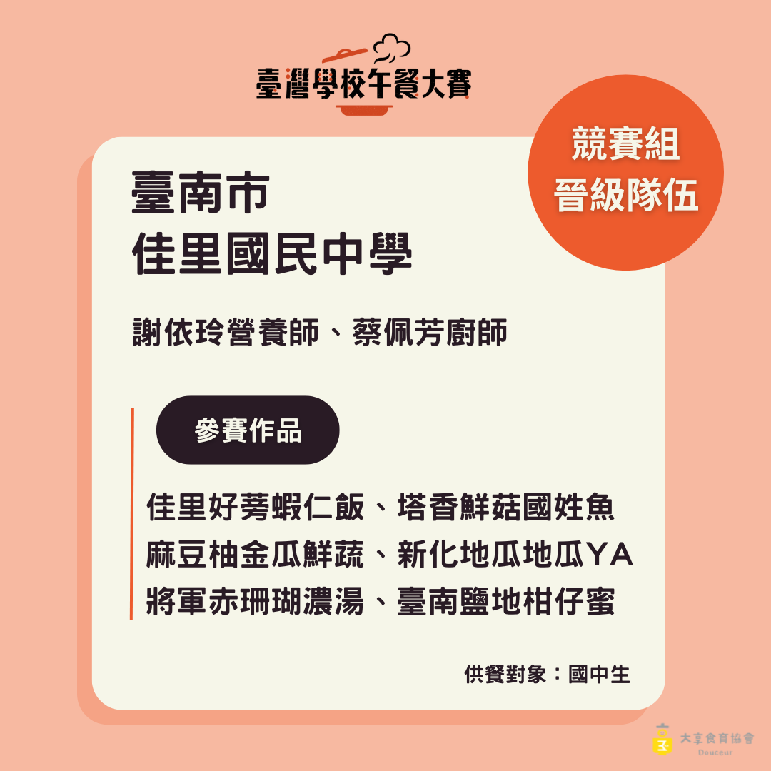 【2024年3月22日公告】 2024 第七屆臺灣學校午餐大賽「晉級決賽名單」出爐! 2024年4月27日至28日,來自全國6縣市12組24名現職學校午餐從業人員將踏上全國舞台,爭取一年一度最佳學校營養午餐的榮耀! 精彩賽事訊息不漏接:https://www.foodiedu.org/project/2205 恭喜以上晉級隊伍!