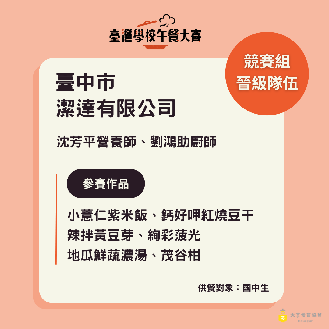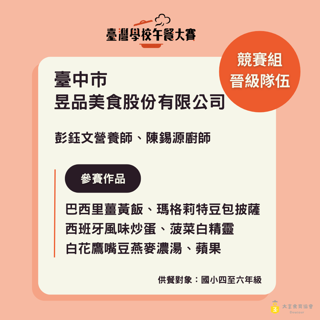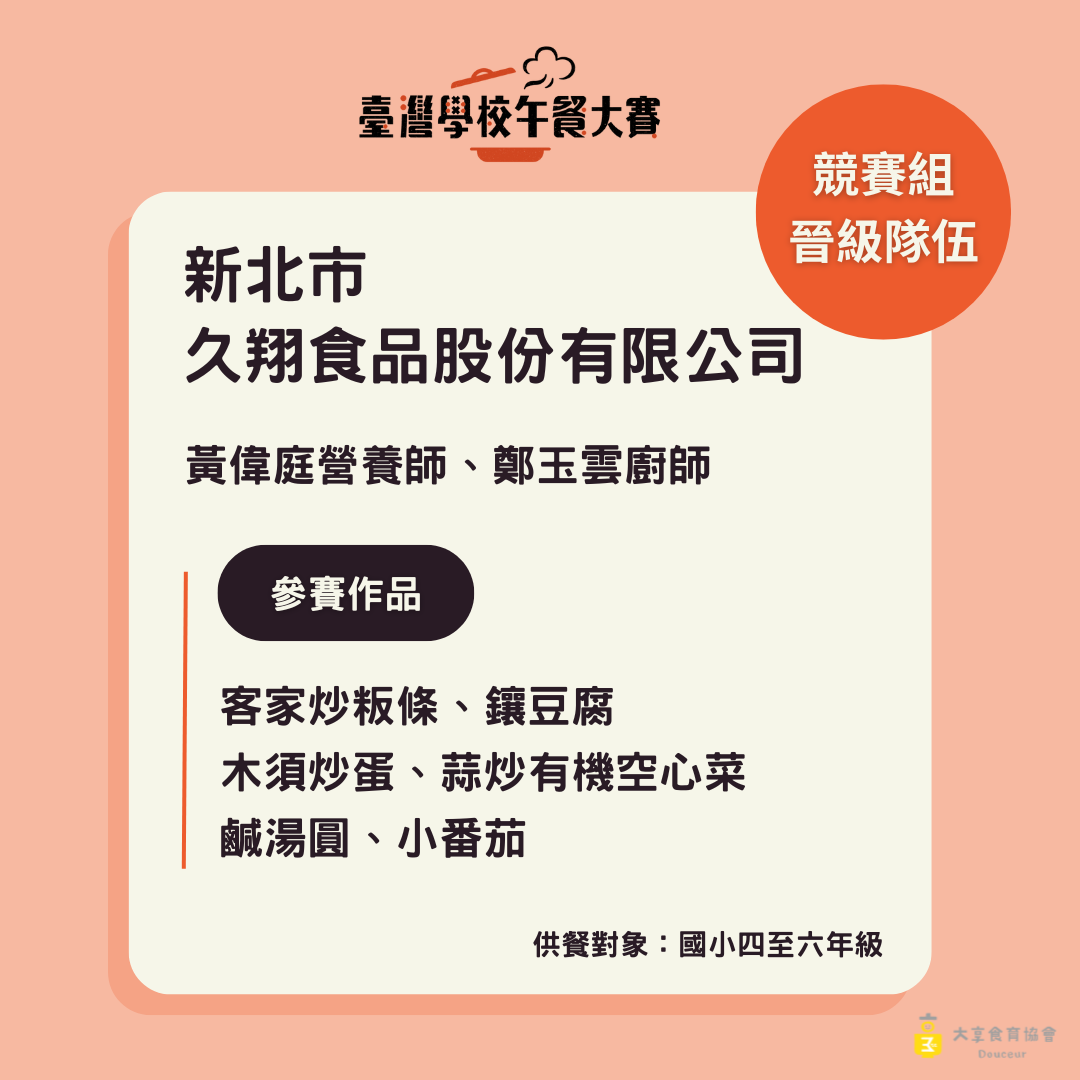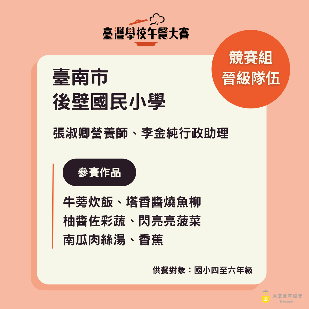 【2024年3月22日公告】 2024 第七屆臺灣學校午餐大賽「晉級決賽名單」出爐! 2024年4月27日至28日,來自全國6縣市12組24名現職學校午餐從業人員將踏上全國舞台,爭取一年一度最佳學校營養午餐的榮耀! 精彩賽事訊息不漏接:https://www.foodiedu.org/project/2205 恭喜以上晉級隊伍!