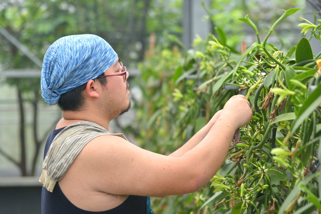 進場三年後,三合院迎來香莢蘭第一次開花,因花朵壽命僅約半日,又無法自行授粉,想增加結莢量就只能靠人工。於是一家人與時間賽跑,在花朵閉合前擔任「大蜜蜂」,用鑷子挑起香莢蘭的花粉塊,幫一朵朵香莢蘭作媒。