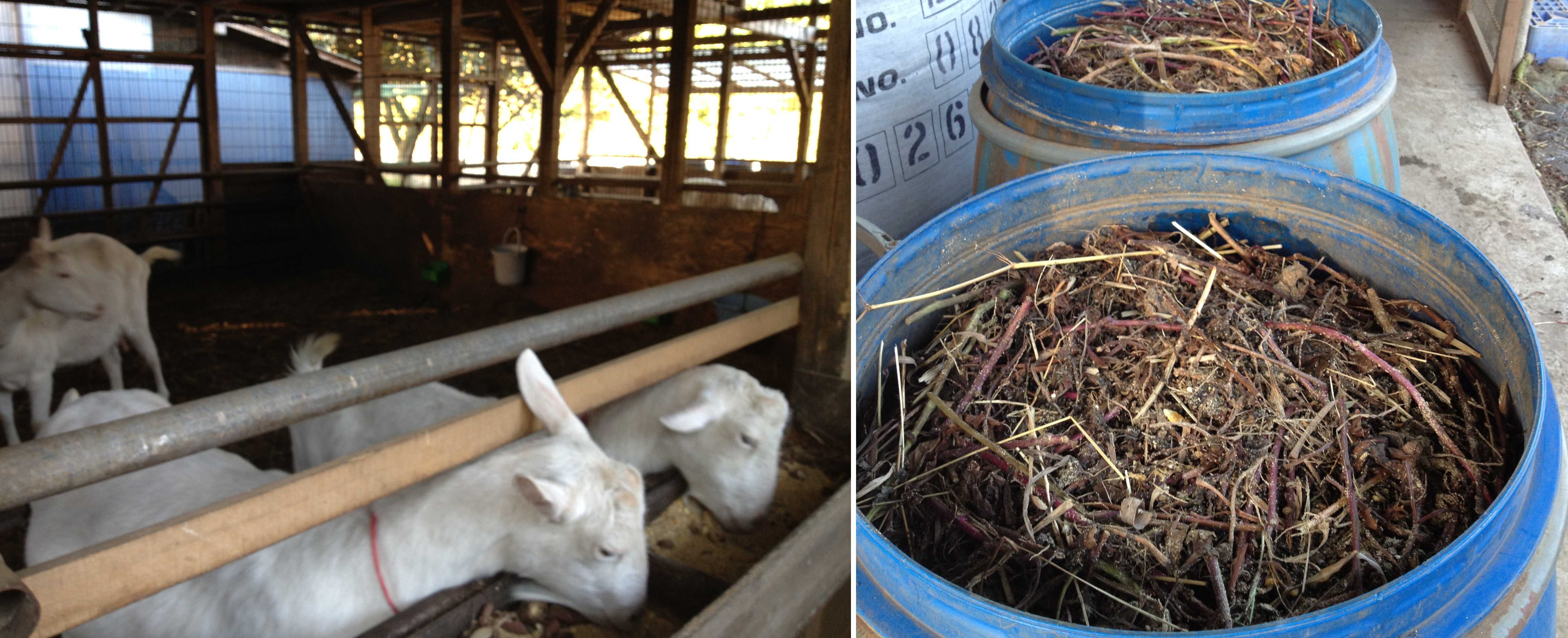 木之花非常重視「菌」。能有這般豐富的餐桌風景,要說全部都是微生物的功勞也不為過。以EM菌(註1)為基礎,在30度的水中加入糖蜜、自家糙米胺基酸,以及松、枇杷、熊笹等具有抗酸化力的葉子,薄荷、甜菊等香草,還有橘子皮、大豆粕等材料,經過九天的熟成所培養出的「木之花菌」,除了稀釋作為每日的飲料,也使用於發酵堆肥、作物的澆灌水和葉面散佈,另外,還混入雞和山羊的飼料和飲水中,因此雞舍和羊舍完全無臭,這些飽含微生物的動物糞則是堆肥的最佳材料之一。木之花還有兩間生態廁所,也是因為微生物的活動完全沒有異味。