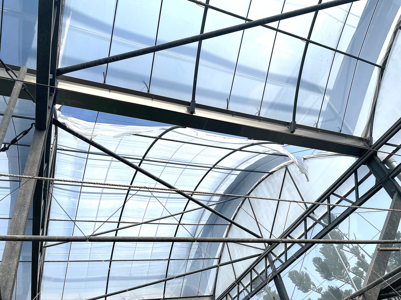 災後需修復的溫室數量極高,溫室師傅國雄與團隊每天上午 5 點半開工,晚上 7 點才能下班,在各個溫室裡爬上爬下,頂著烈日修修補補。但他手上光是「維修」工作就已排到年底,若溫室需要的是「重建」,最快得等明年才能開工。
