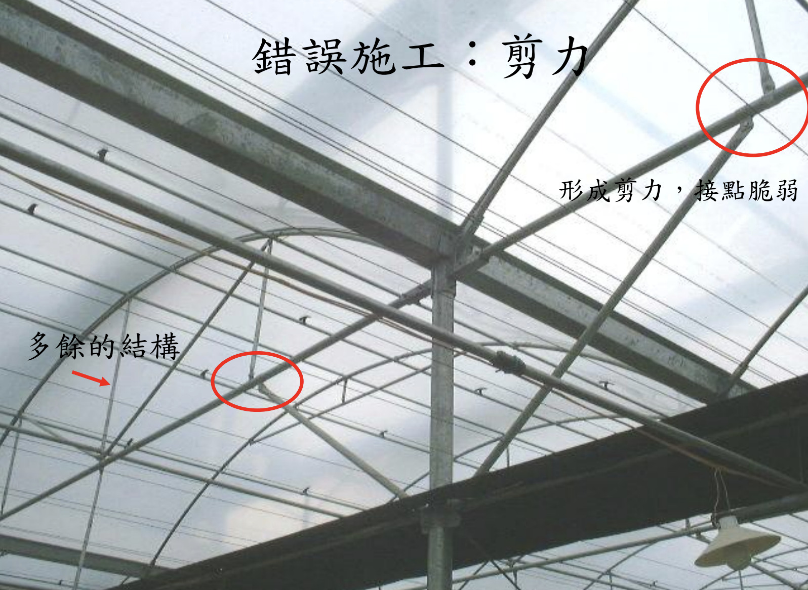 溫室從上到側都有許多細節要注意,方煒表示,若要支撐起屋頂,屋頂的重力應該由立柱分擔,作爲主結構的天溝,與橫梁、斜支撐的雙向接點應盡可能集中,立柱與斜支撐的接點則要減少晃動的剪力,塑膠布溫室的圓拱屋頂可採 H、V、W 或 M 型支撐結構補強,溫室側面也必須補強,否則不堪一擊。