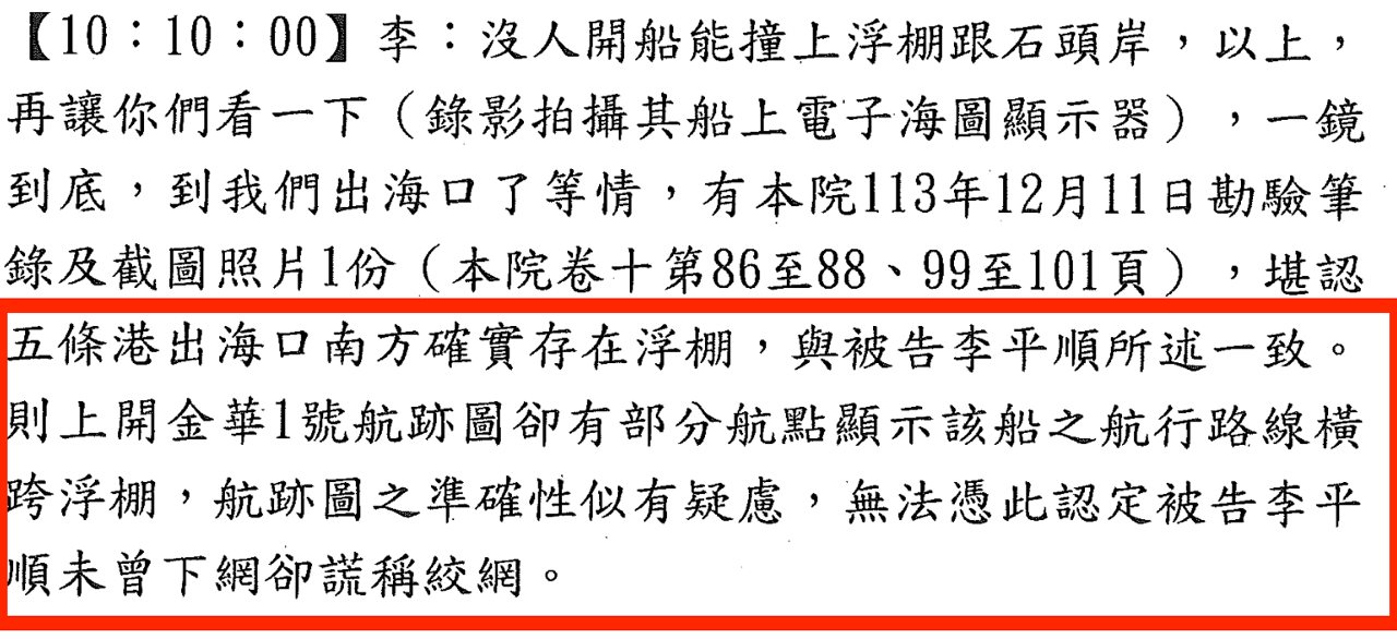 然而,判決書當中寫道,海巡安檢所記錄的漁船出入港登記為「人為謄打記錄」,可能存在誤載、漏繕情況(判決書 p.42);其次,作為證據的「航跡圖」,法官對照完李平順出示紀錄──漁船實際出港航行必須繞經蚵田的地形地貌後,認為雷達航跡圖存在不合理,作為指控漁民「謊稱絞網」,其「準確性似有疑慮」(判決書 p.44)。