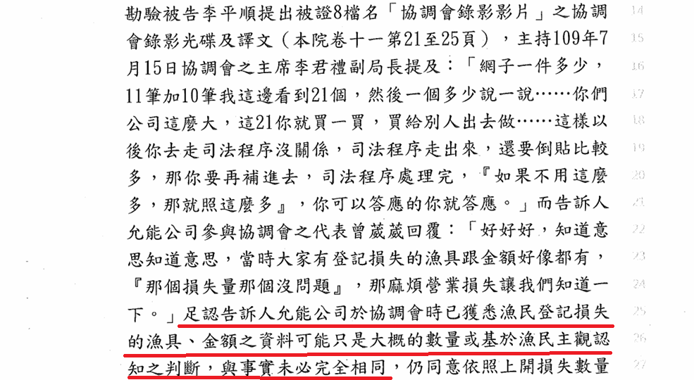 當時主持協調的李君禮建議開發商代表,「你要加一點 サービス(日語優惠、招待)」,更稱如果走完法律程序,賠償金額更高就依照法律,如果程序走完金額降低,仍應依協商金額走,並在協調會後一週內就該匯款給漁民。(判決書 p.31-32)