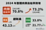 2024 年《糧食供需年報》出爐,以熱量為權數計算的糧食自給率,難得止跌回升,由去年的歷史新低 30.3% 微幅升至 30.7%,食米量也從連年下探的的 42.1 公斤,回升至 42.4 公斤,止住六年來的跌勢。蔬果自給率則因氣候天災雙雙下滑,蔬菜自給率創下 11 年來新低,進口市佔率則維持約兩成。