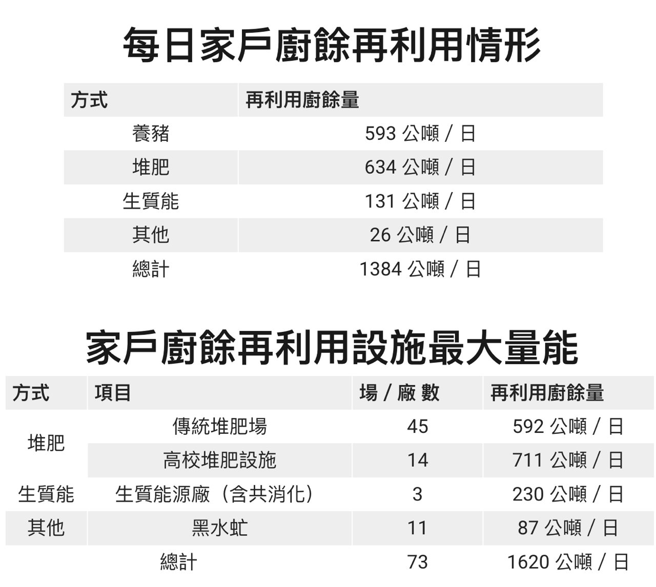 當初為解決廚餘問題,台中市、桃園市、新北市先後設立生質能源廠及中心,但對比過往新聞稿及發言內容,三處生質能廠及處理中心,均與當初宣稱的最大處理量能存在落差,顯見生質能無法完全收納廚餘。
