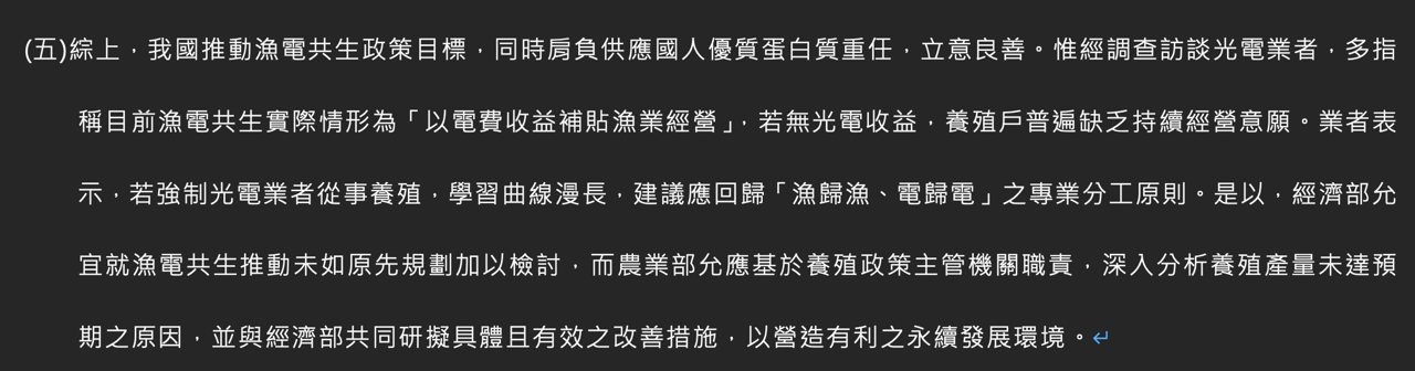 報告指出,漁電共生上路以來,若無光電收益補貼,養殖戶普遍缺乏持續經營意願,而若強制光電業者投入養殖,則難以克服專業門檻。針對光電業者希望漁電共生不再強迫光電肩負養殖責任,監察院要求經濟部與農業部研擬有效措施,檢討改善。