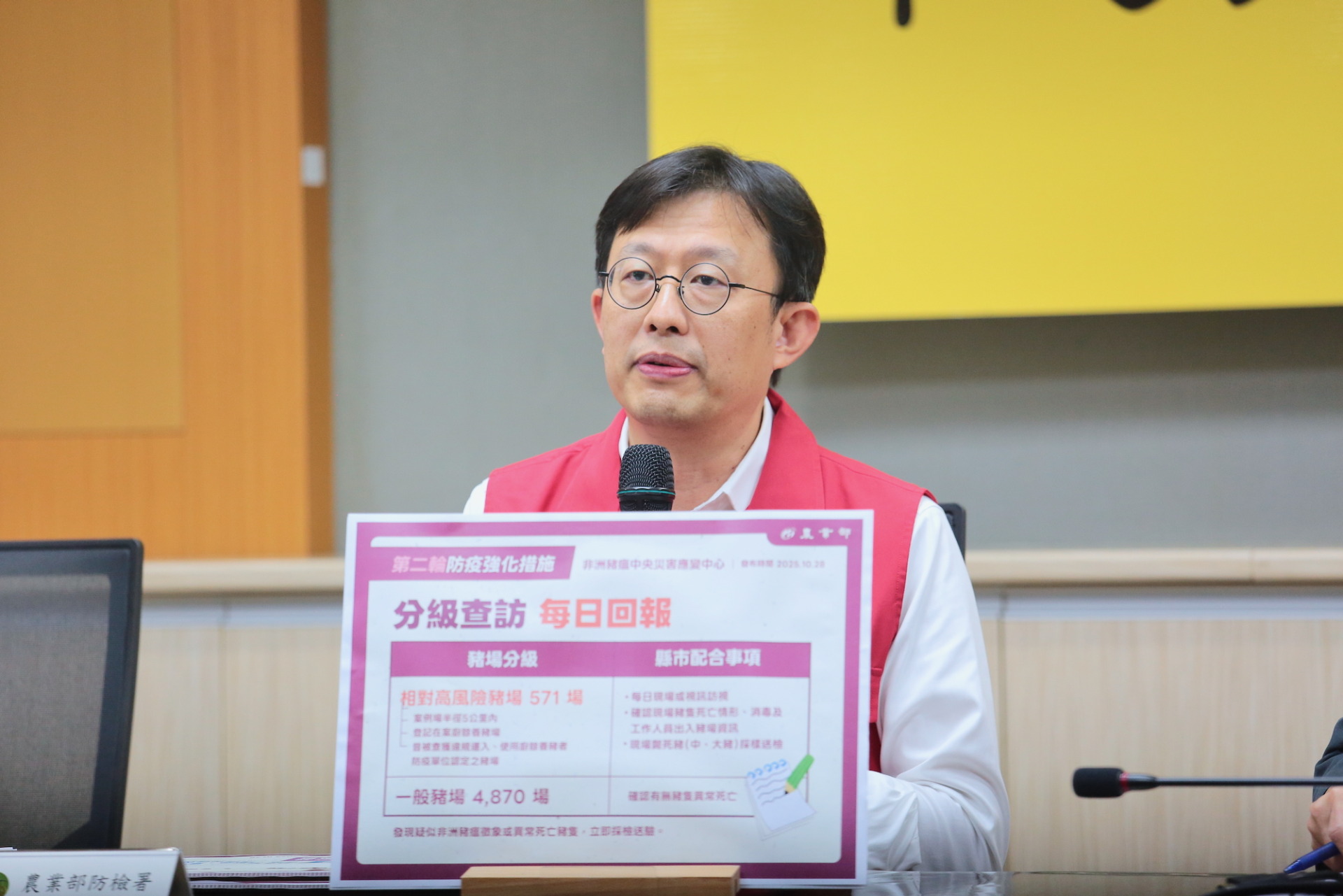 林志憲說明,高風險豬場共 571 場,接下來必須每天確實消毒、確認場內豬隻健康狀況,各地縣市政府也會確認豬隻有無異常死亡;今日也已對全國豬隻屠宰場、肉品市場擴大消毒,重點鎖定豬隻繫留區、廢棄物貯存區。
