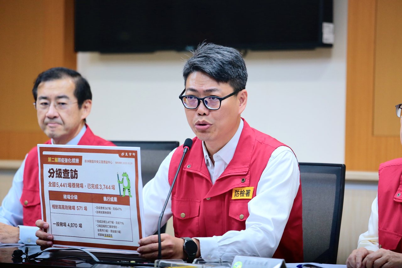 為控管風險,中央災害應變中心已針對 571 高風險場進行每日監控,已完成47%,全國 5441 家養豬場已訪視 3744 場、訪查進度為 71%,均未有異常。