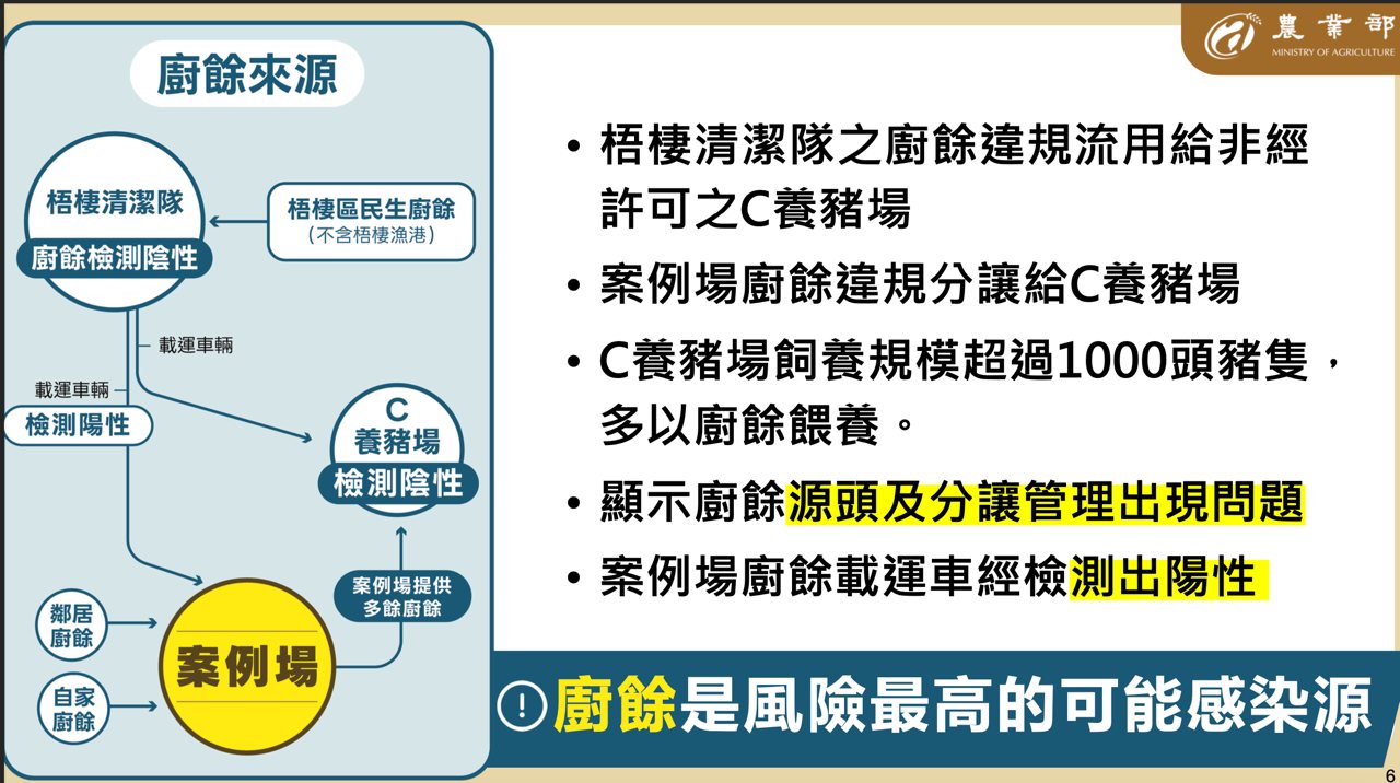 梧棲清潔隊的廚餘,主要來自梧棲區民生廚餘(不含梧棲漁港),廚餘屬於廢棄物,處理需依《廢清法》招標,理論上僅可由投標的案例場專用,但疫調小組循線追查,發現到梧棲清潔隊的廚餘違規留用給 C養豬場,案例場也會提供多餘廚餘給 C 養豬場,顯示出廚餘源頭及分讓管理出現問題。