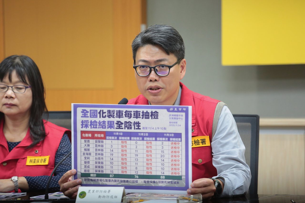 林念農特別說明,檢驗原則為每車原採 5 件,但若有疑似出血、腫脹等症狀的斃死豬,便一率採檢,11 月 1 日至 11 月 2 日採檢 163 車次,結果均為陰性,昨(3)日採檢 88 車次,目前尚在檢驗中;11 月 2 日至 11 月 3 日全國並無疑似症狀的死亡豬隻,但彰化縣、台南市、屏東縣出現化製異常,14 頭檢驗結果均為陰性。