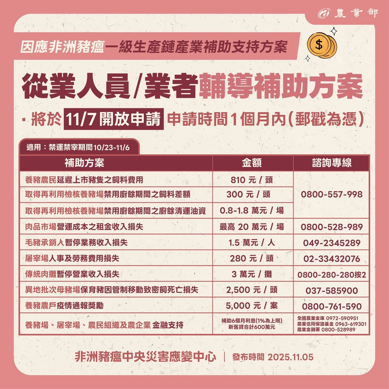 此外,一級生產鏈補助支援方案自 11 月 7 日起開放申請,為期一個月,以郵戳為憑。針對溫體豬肉攤的營業損失,經濟部補助每攤 3 萬元。商業發展署副署長陳秘順說明,將由地方政府協助造冊,造冊後送至商業發展署,後續會將補助款直接匯入攤商的帳戶。