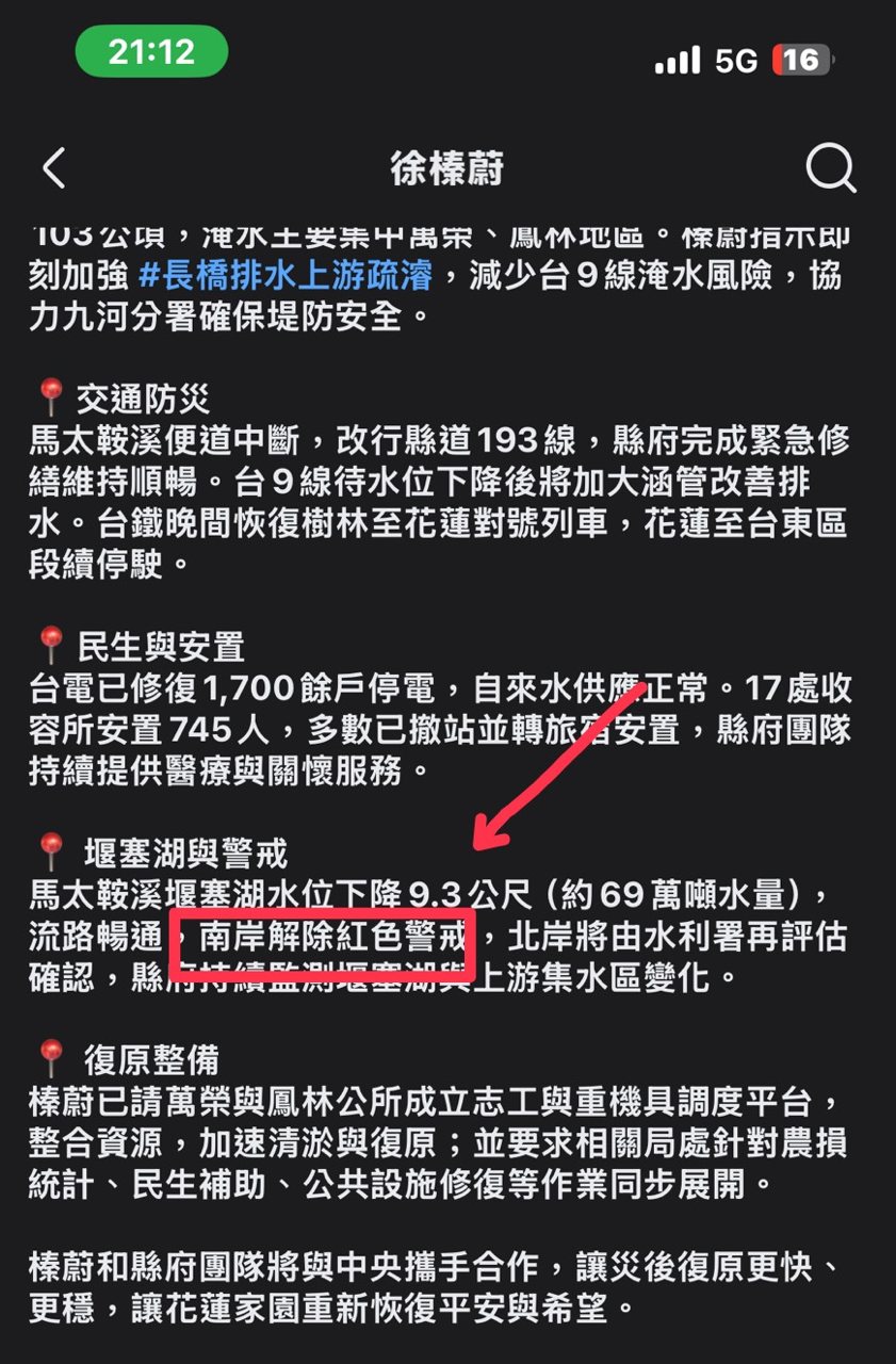 然而這則貼文隨即被迅速刪除,縣長也未再做出任何說明。對於馬太鞍溪警戒分南北岸、以及南岸先解除紅色警戒的說法,林保署花蓮分署長黃群策不願多做回應,僅表示「可能要問縣政府」。不過從縣長發文又隨即刪文的行徑來分析,徐榛蔚失言的可能性比較高。
