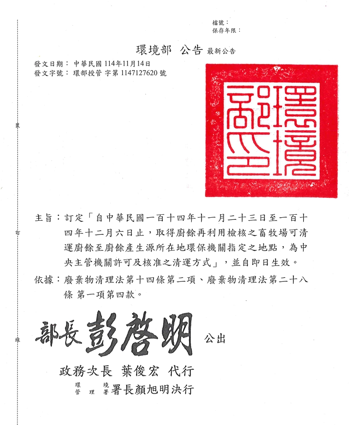 為協助清運廚餘,環境部今(14)日公告,自 11 月 23 日至 12 月 6 日止,取得「廚餘再利用檢核」的畜牧場可清運廚餘,並清運至廚餘產生源所在地環保機關指定之地點,亦即,廚餘養豬戶可以協助清運,但仍不可使用廚餘養豬。