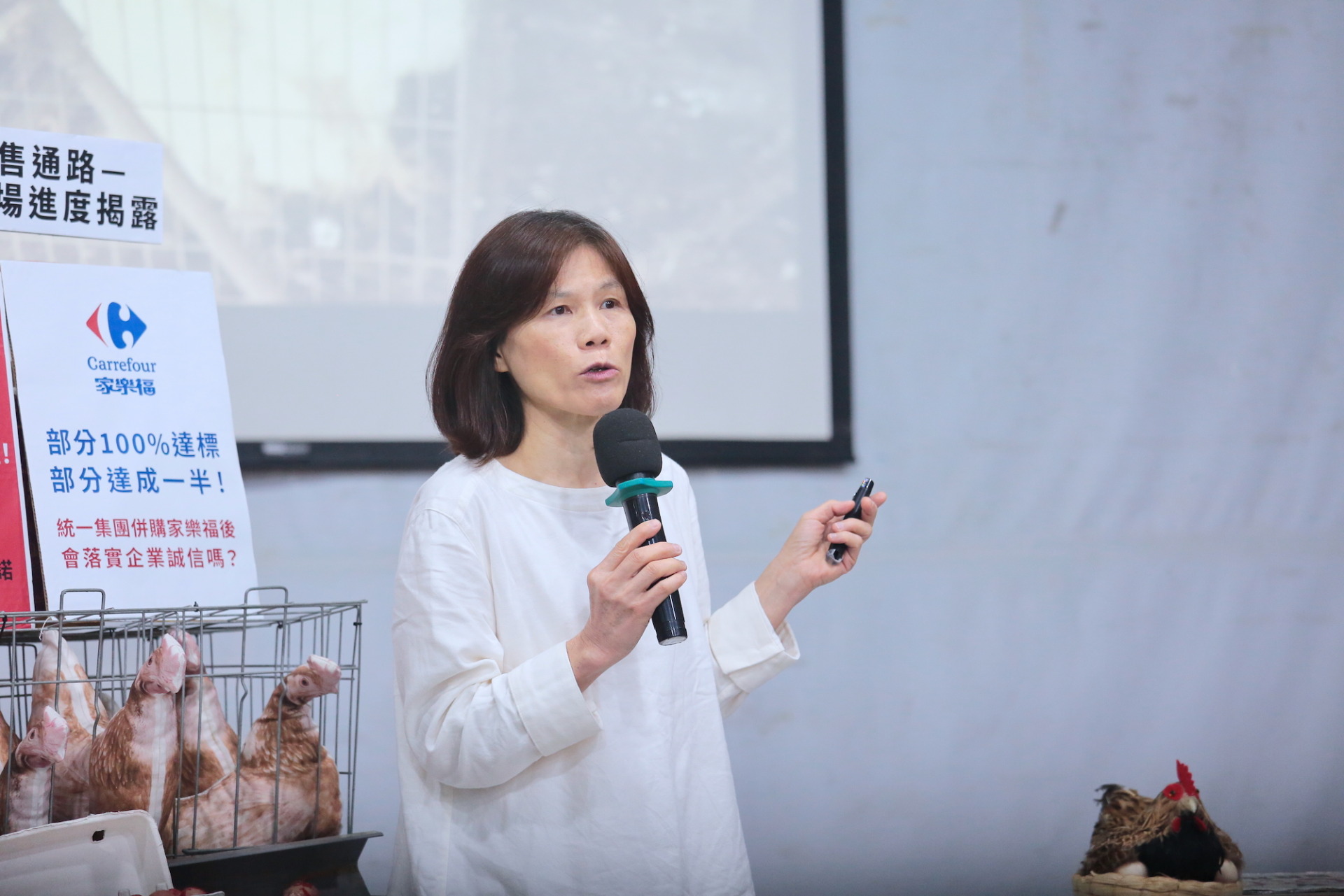 陳玉敏表示,全聯是最漠視動物處境的通路,全聯是連鎖超市的龍頭、年營收高過 2000 億元,而在今(2025)年併購大潤發、將其改名為大全聯後,更直接破壞過往法商大潤發的承諾,2021 年大潤發的非籠飼雞蛋比例已達 37%,但被全聯併購後,全聯灌入大量格子籠雞蛋,目前大全聯架上的非籠飼雞蛋僅剩 7.14%。