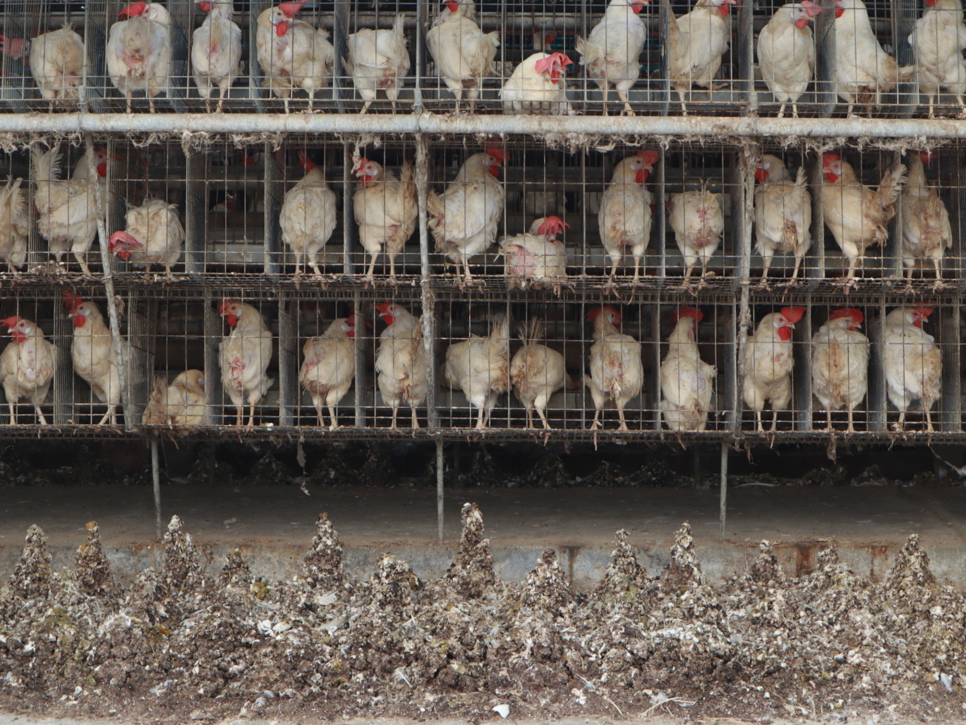 國人一年吃掉 70 億至 80 億顆蛋,動社副執行長陳玉敏指出,國內蛋雞場約 70% 至 75% 仍為傳統格子籠,母雞終其一生只能生活在 A4 大小的空間裡,飽受高溫、風吹,格子籠下方則堆積大量雞糞,髒亂的飼養環境讓母雞緊迫,也讓動物用藥、抗生素成為日常。
