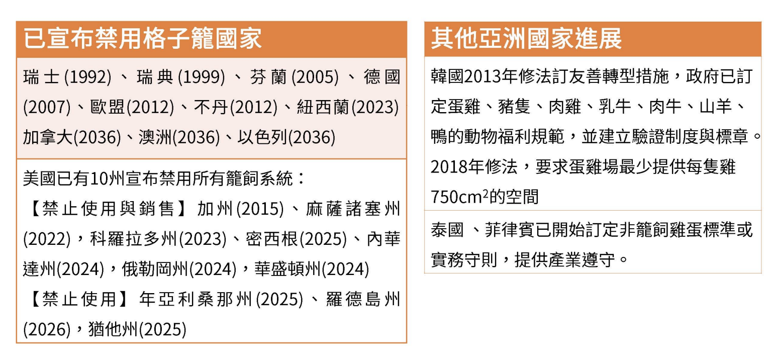 陳玉敏說明,諸多科學研究結果指出,格子籠雞蛋不利於食品安全健康,籠養造成母雞體弱多病,無法避免使用抗生素及藥物,於是歐盟於 2012 年正式宣布不再使用格子籠養雞,而後紐西蘭、加拿大、澳洲、以色列、美國多個州陸續跟進。