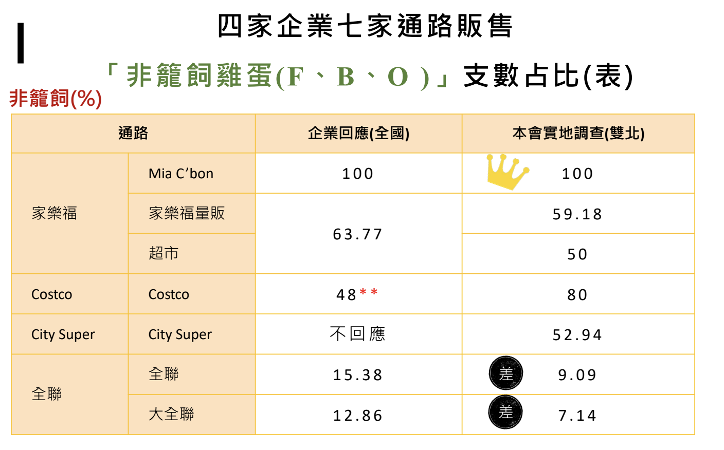 國內有四家企業都曾承諾要提供非籠飼,包含全聯、家樂福、Costco 和 City Super,動社對四大企業、共計 7 品牌門市進行問卷及雙北實體通路調查,家樂福的 Mia C’bon 超市販售非籠飼雞蛋的比例高達 100%,家樂福其它超市及量販店分別為 5─6成, Costco 及 City Super 約一半,全聯及大全聯供應非籠飼雞蛋比例,則均不到一成。