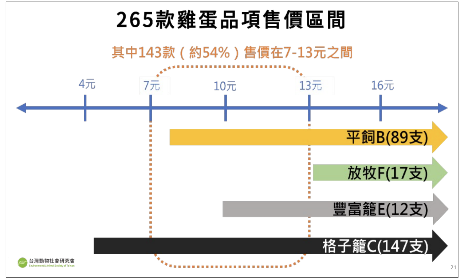 有民眾認同動物福利雞蛋,但也認為非籠飼雞蛋較貴。動社分析四大零售通路中 265 款雞蛋品項,分析售價後發現,共 143 款的蛋價落在每顆 7 至 13 元,且其中有 97 款為格子籠雞蛋、38 款為非籠飼雞蛋。陳玉敏表示,籠飼、非籠飼雞蛋的價差沒有國人想像中的大,同樣的價格也可能買到格子籠蛋。