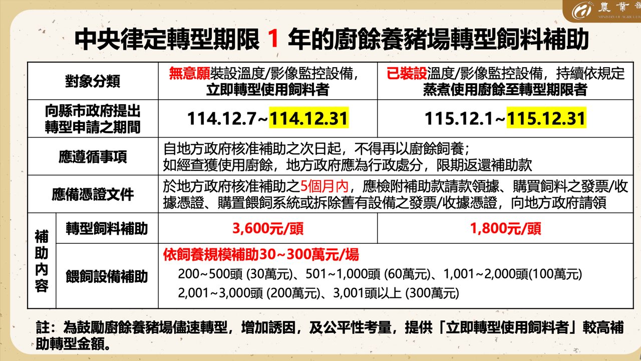 轉用飼料部分,農業為鼓勵廚餘養豬場儘速轉型,增加誘因,及提供「立即轉型使用飼料者」較高補助轉型金額。無意願裝設溫度/影像監控設備、立即轉型使用飼料者,於本(12)月向縣市政府提出轉型申請,轉型飼料補助為每頭 3600 元。