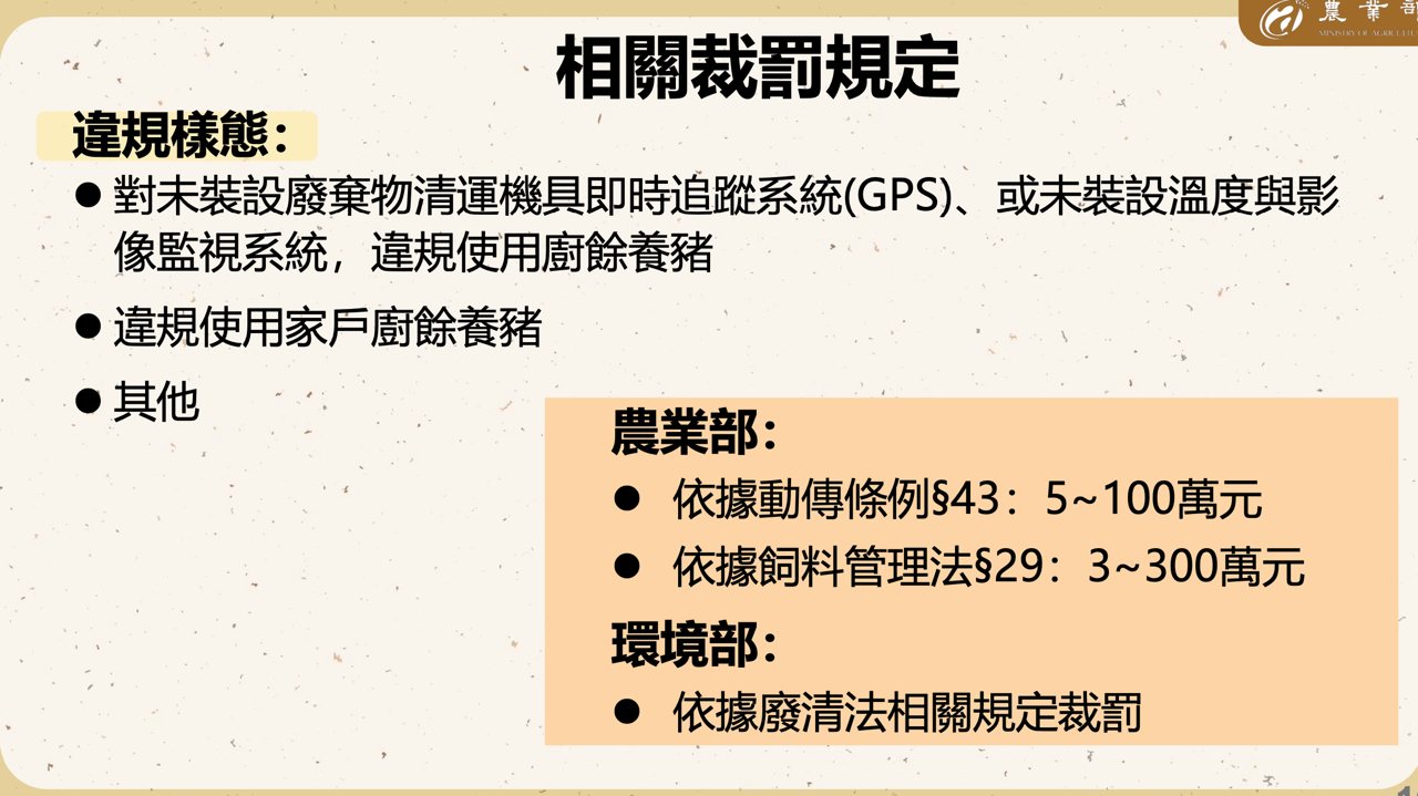 先前豬農未上傳蒸煮照片,無法可罰,環境部已修訂《一般廢棄物清除處理方式》、《共通性事業廢棄物再利用管理辦法》。違規使用家戶廚餘養豬,抑或是未裝設廢棄物清運機具即時追蹤系統(GPS),或溫度與影像監視系統,也屬違規,環境部會依規定裁罰,農業部也可依《飼料管理法》罰 3 至 300 萬、《動傳條例》罰 5 萬至 100 萬元。