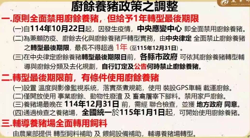 若豬農未來一年仍要廚餘養豬,已裝設溫度、影像監控設備,並持續依規定使用蒸煮廚餘,至最後期限者,則應於明(2026)年 12 月向縣市政府提出轉型申請,但轉型飼料補助則降至每頭 1800 元。