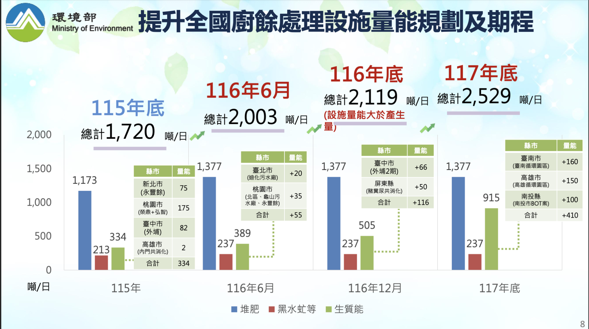 環境部請各縣市積極辦理,提升或增設堆肥、黑水虻、生質能等再利用設施,以疫情前全國每日產生廚餘 2115 公噸,環境部預估,至 2027 年底,全國廚餘處理設施量能,將達每日 2119 噸,便不再需要焚燒、掩埋。
