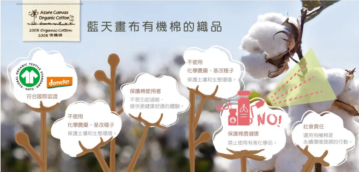 當我們享受棉織品的舒適與柔韌時,往往忽略了背後農藥殘留的環境成本,以及廣泛普遍血汗勞工造成的陰影。有機棉公司藍天大地,自2006年創立以來 ,便肩負起「重建人與自然的關係」的使命 ,致力於透過推廣有機棉服飾,達到全球農藥減量的目的 ,期望結合消費者的力量,對環境產生正向循環。
